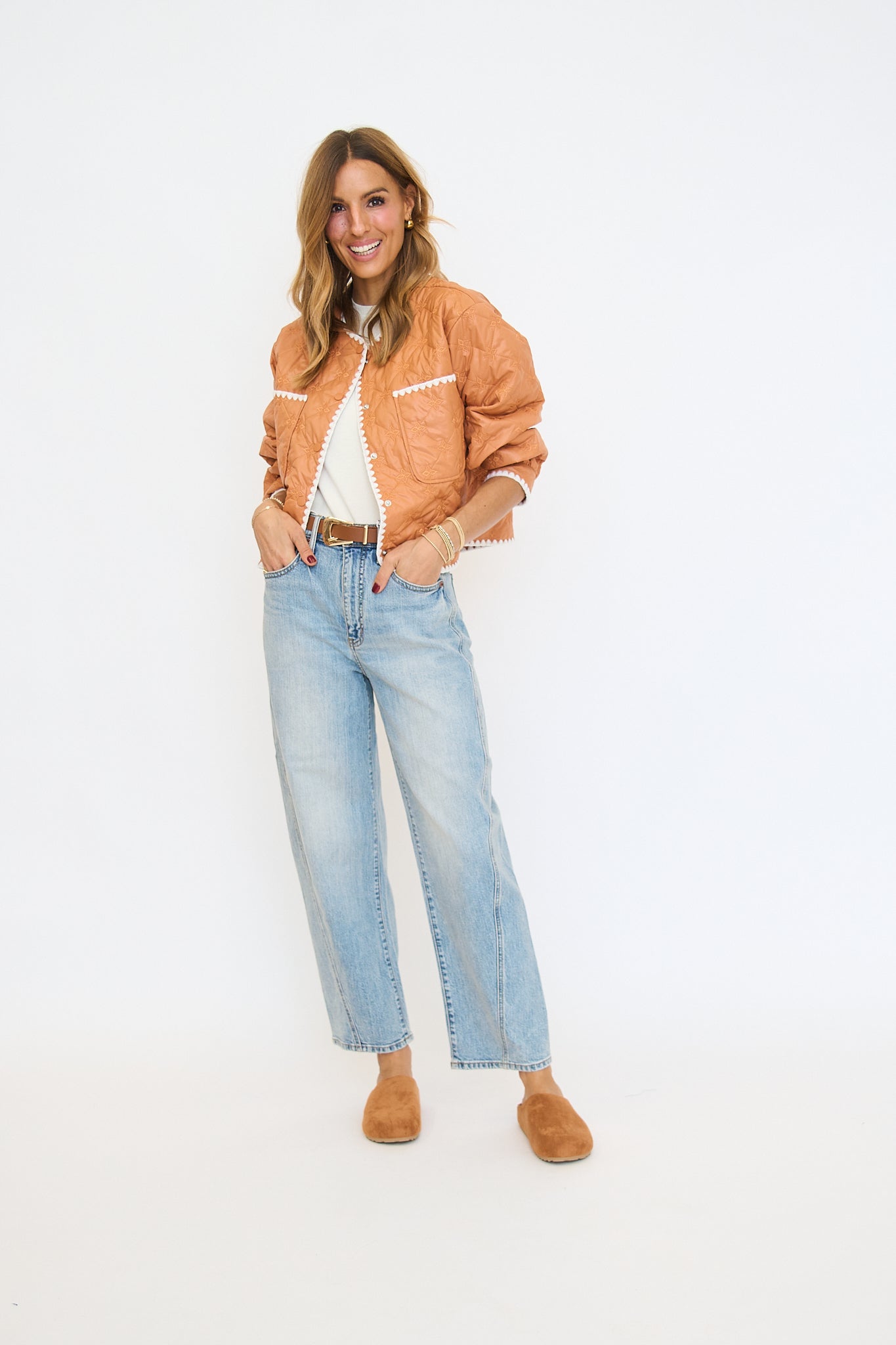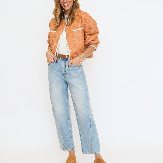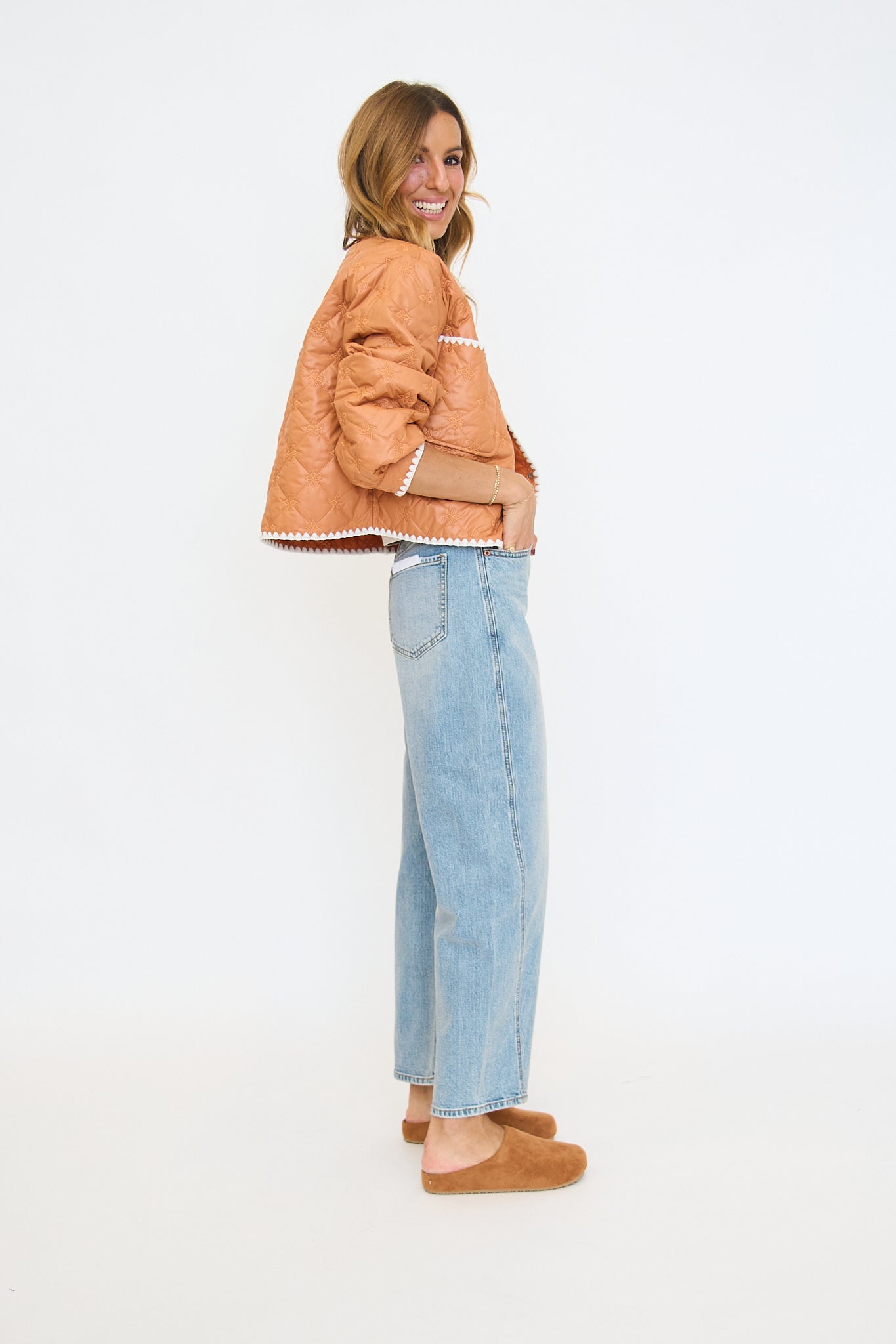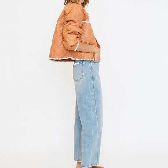 This quilted jacket features an allover diamond stitch pattern and a boxy, cropped silhouette for a modern, cozy vibe. It's accented with contrast scallop trim along the neckline, button placket, cuffs, and pockets for a charming touch. Finished with front patch pockets and snap button closures, it's the perfect blend of cute and functional.