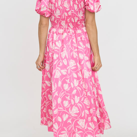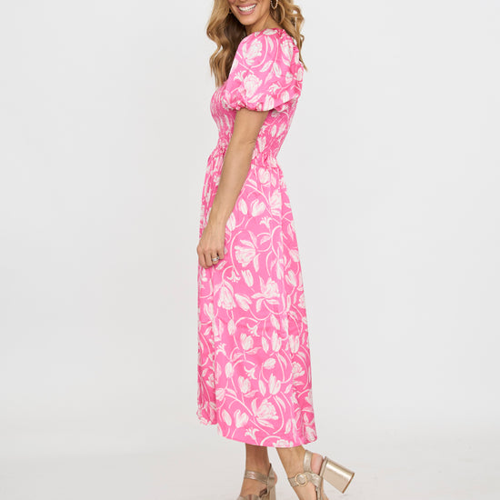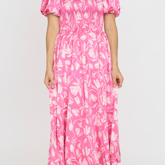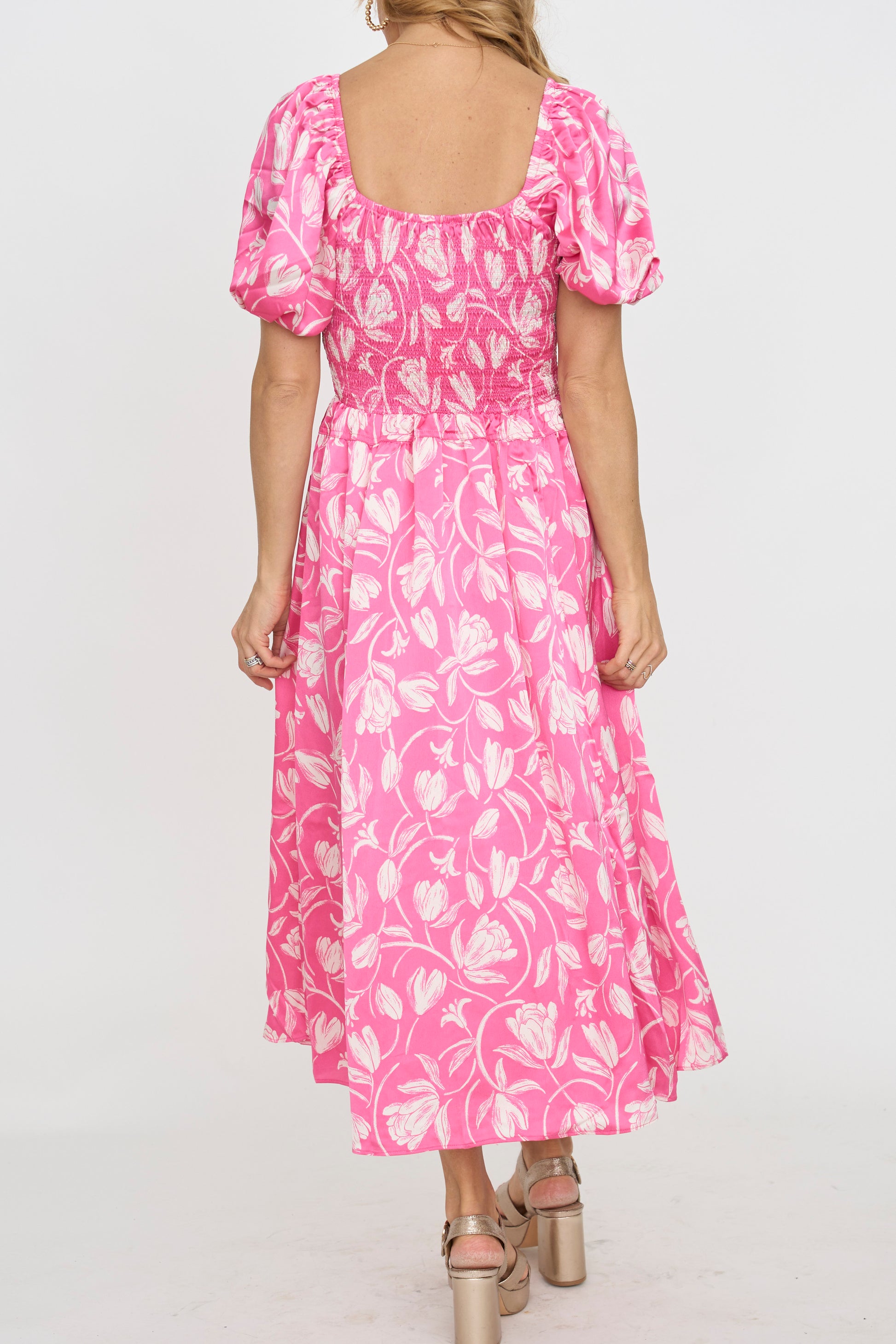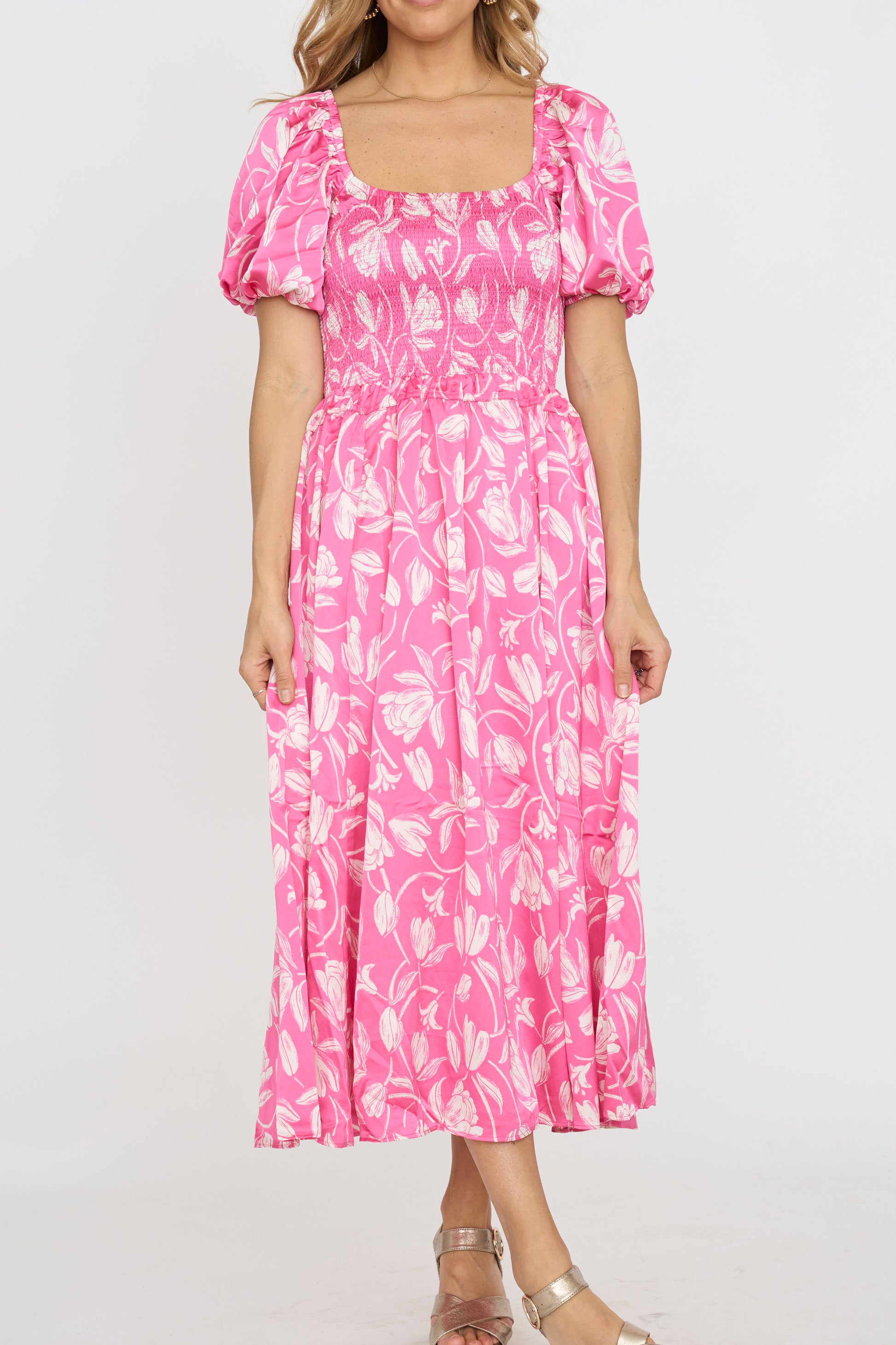 Puff Sleeve Shirred Tiered Smock Midi Dress