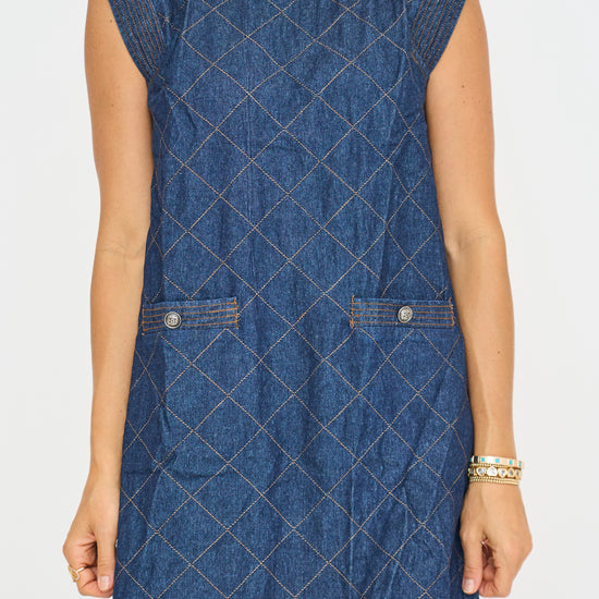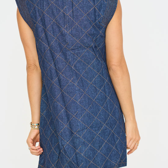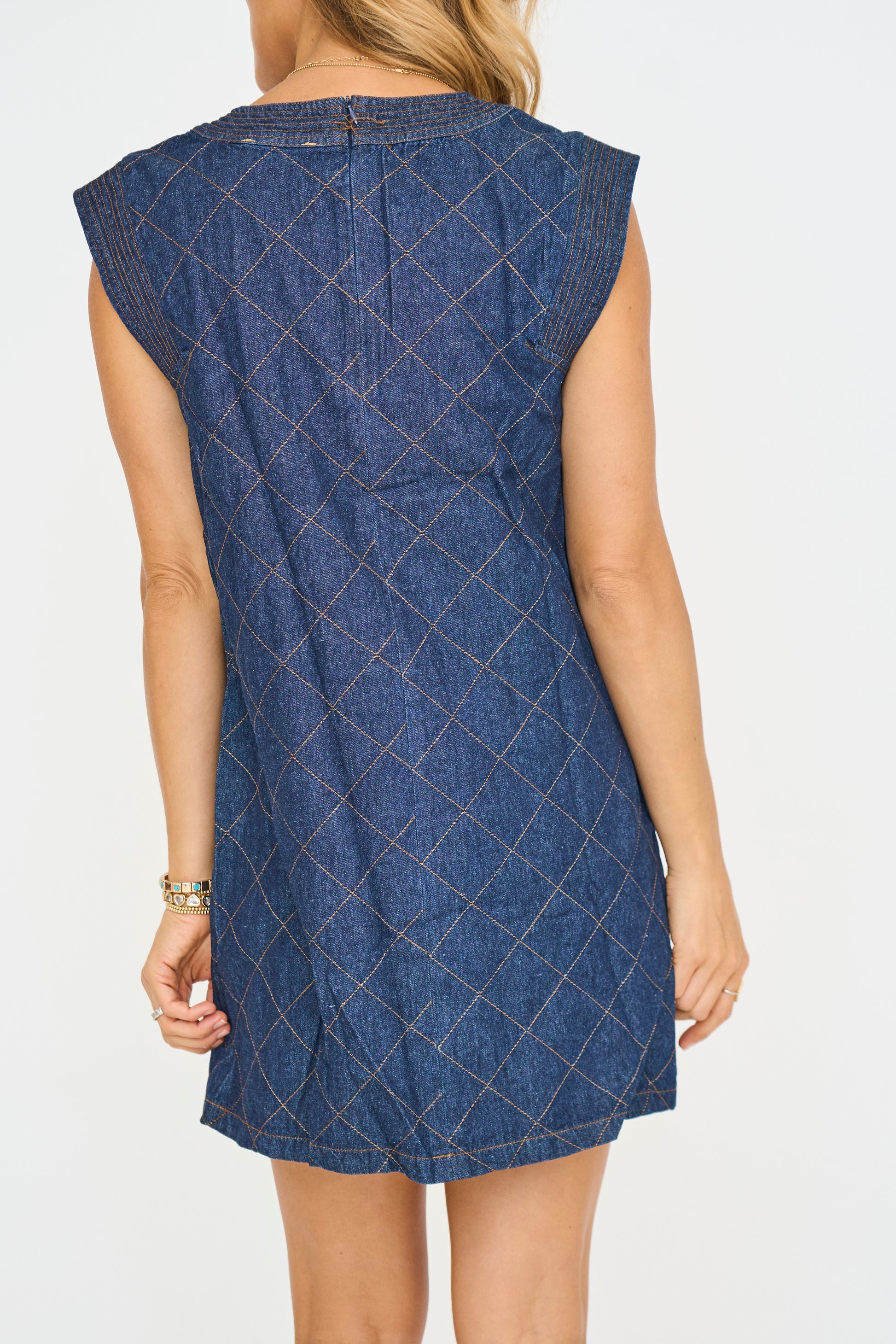 Denim round neck sleeveless mini dress featuring top stitching. Zipper closure at back. Pocket at sides. Unlined. Woven. Non-sheer. Lightweight.