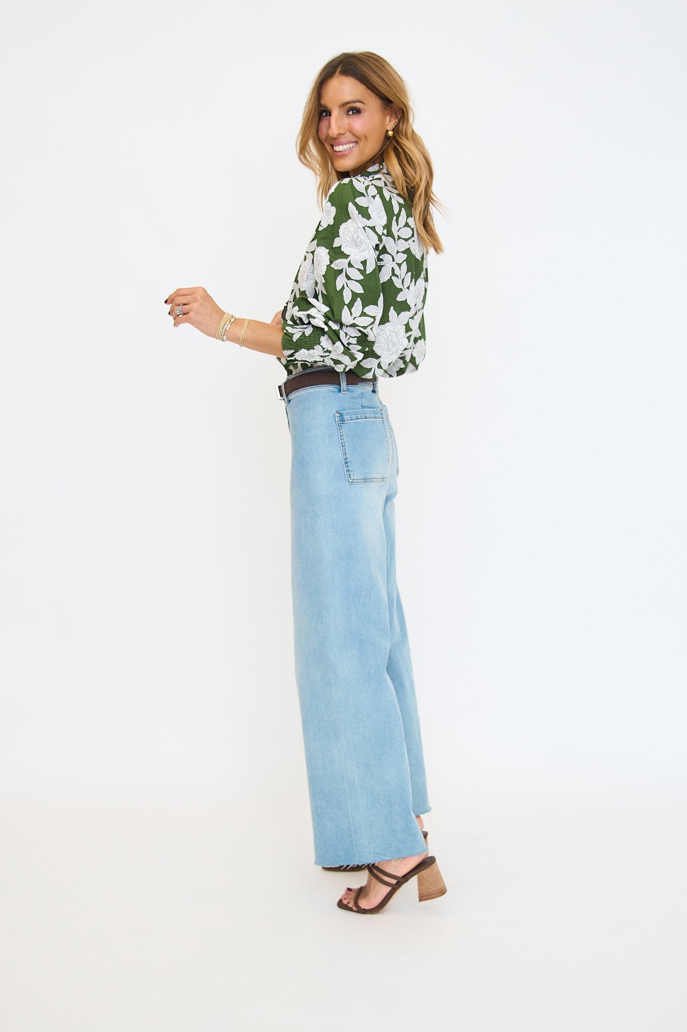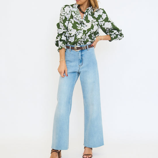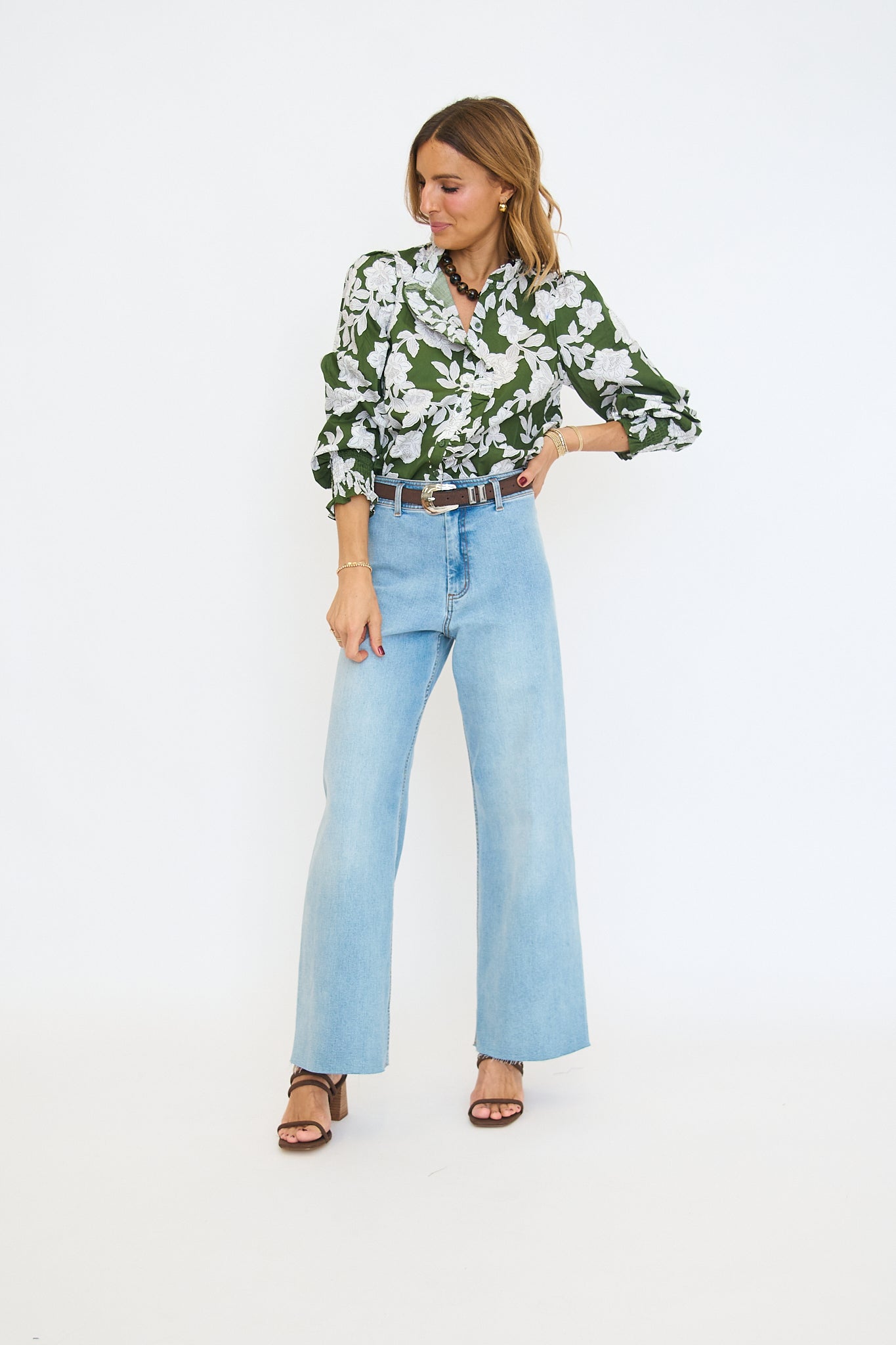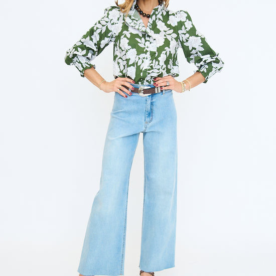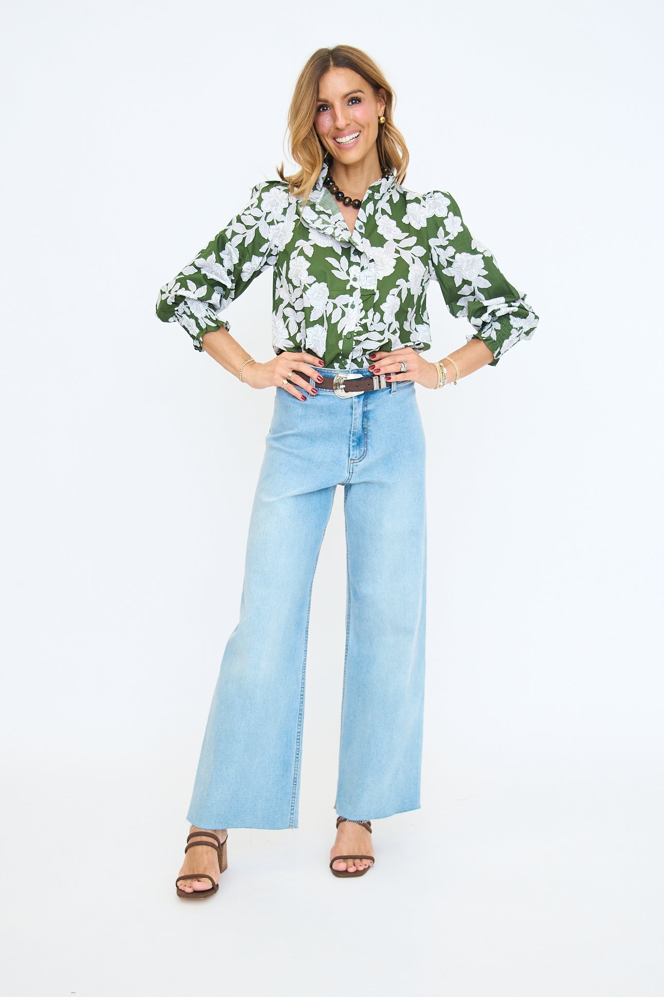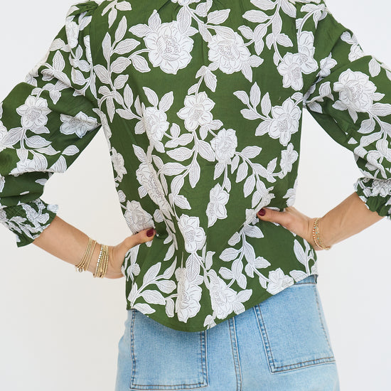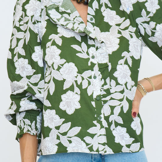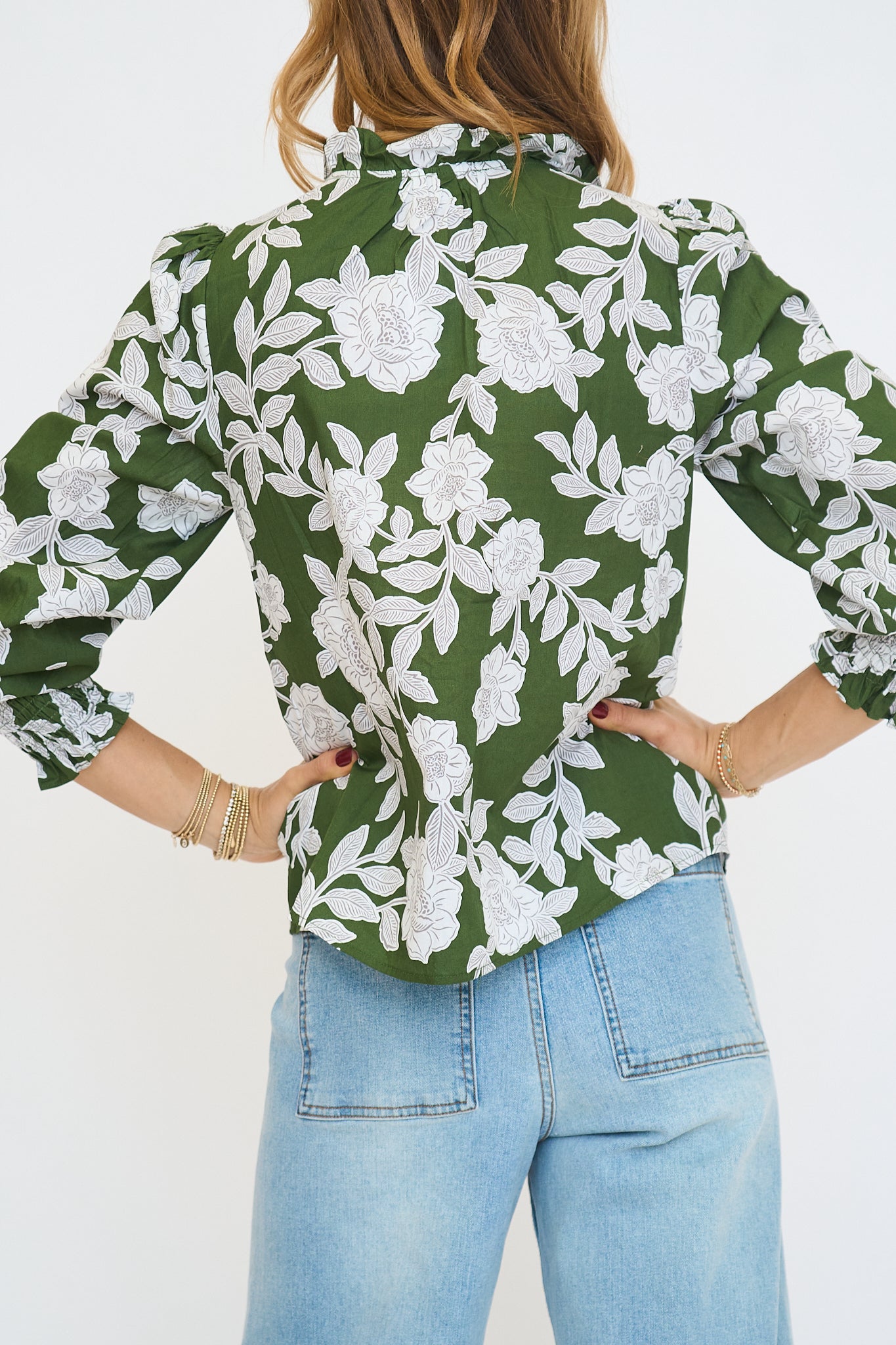 Make every moment memorable with a top that speaks elegance and charm. This long sleeve blouse features a delicate floral pattern, a romantic ruffle neck, button-up front, and smocked cuffed sleeves for a flattering fit. Pair it with your favorite jeans and ankle boots.