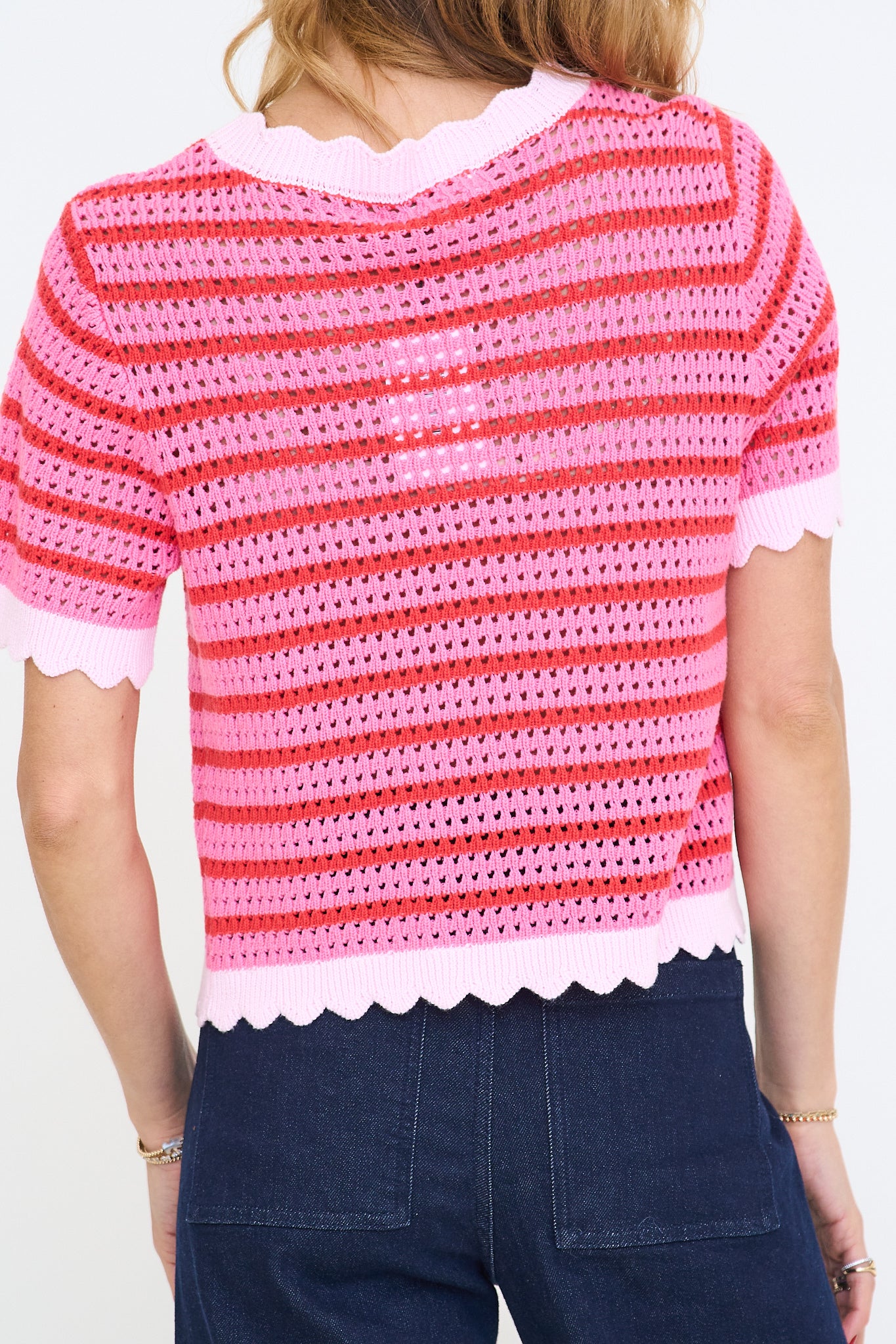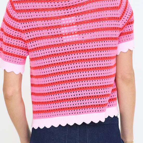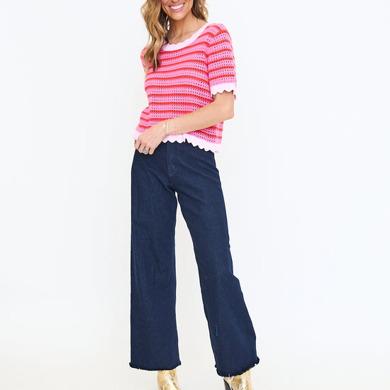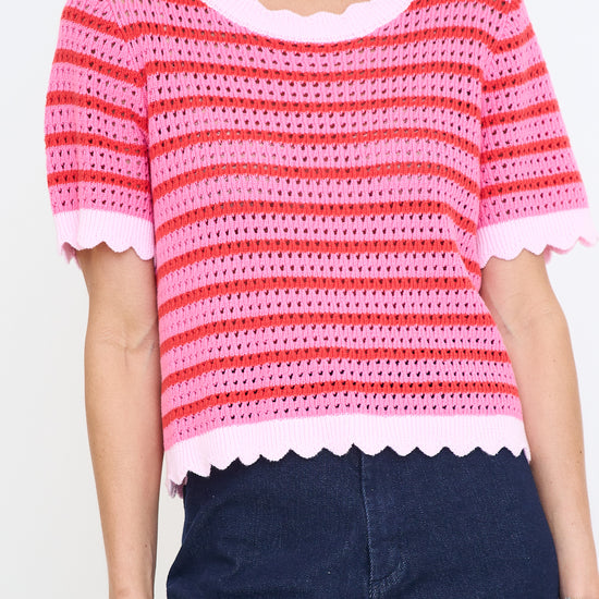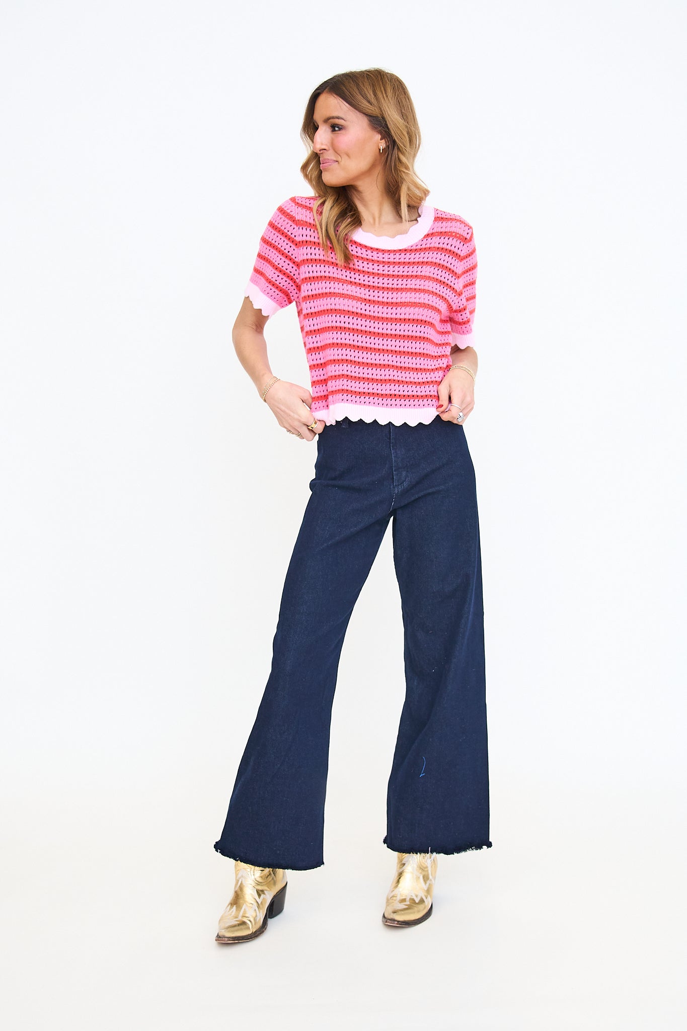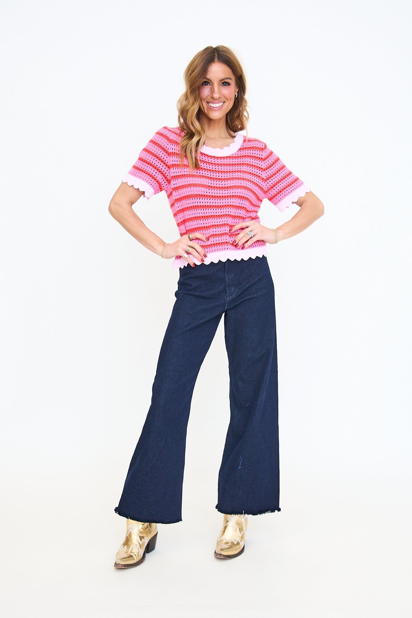 We love a cozy, playful and vibrant touch to your closet with this charming top. The bold, contrasting stripes of hot pink and bright red are complemented by scalloped edges at the crew neck, sleeves, and hem. Style is with high waisted denim pants.