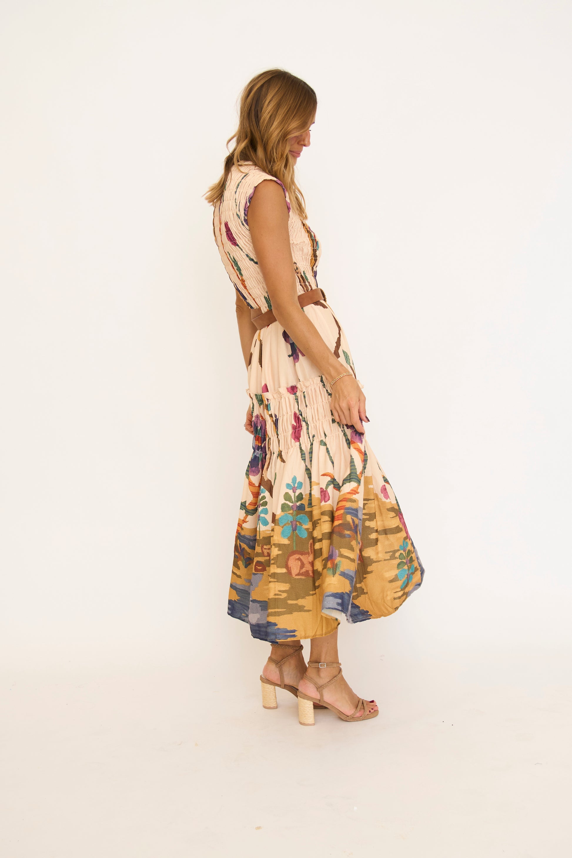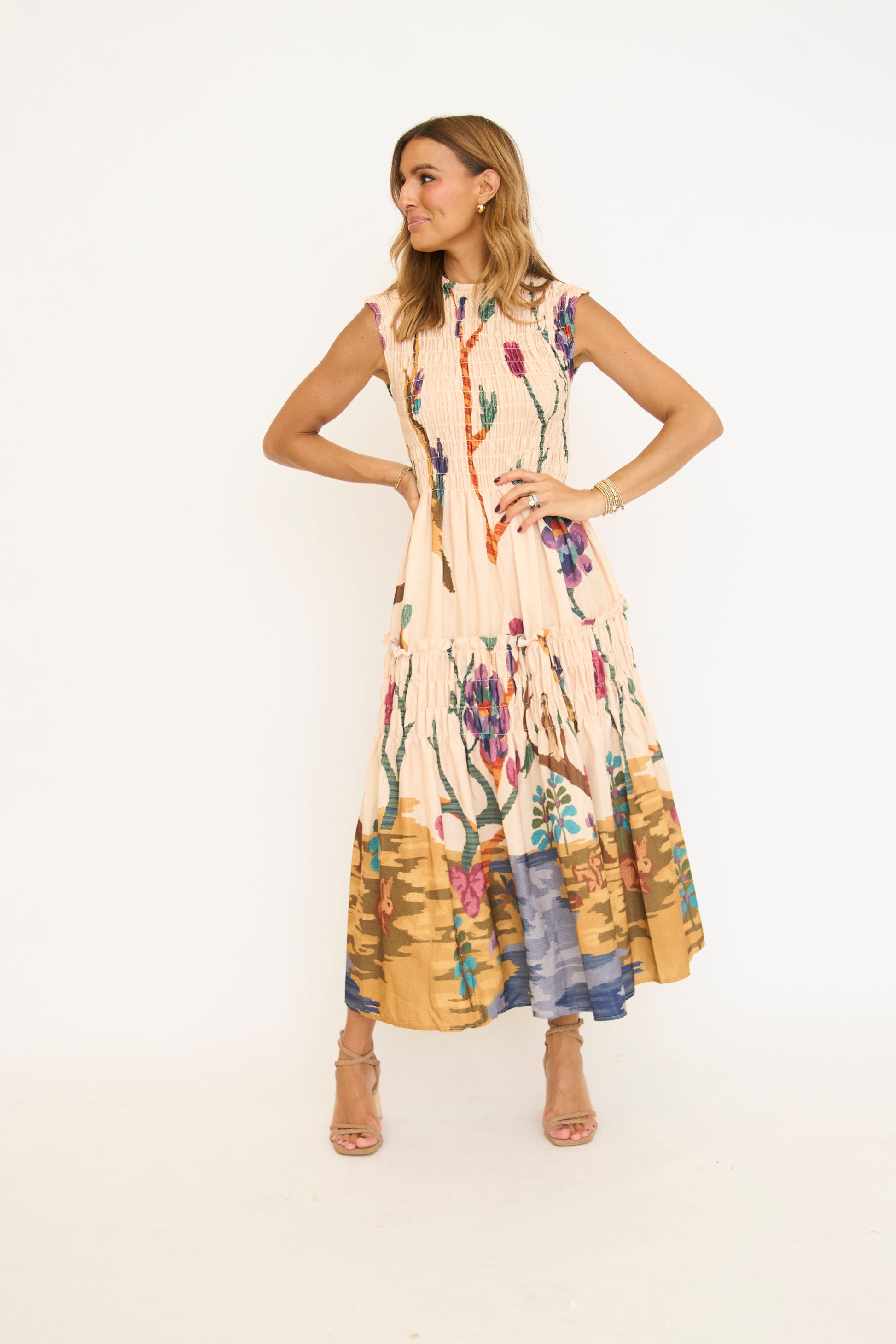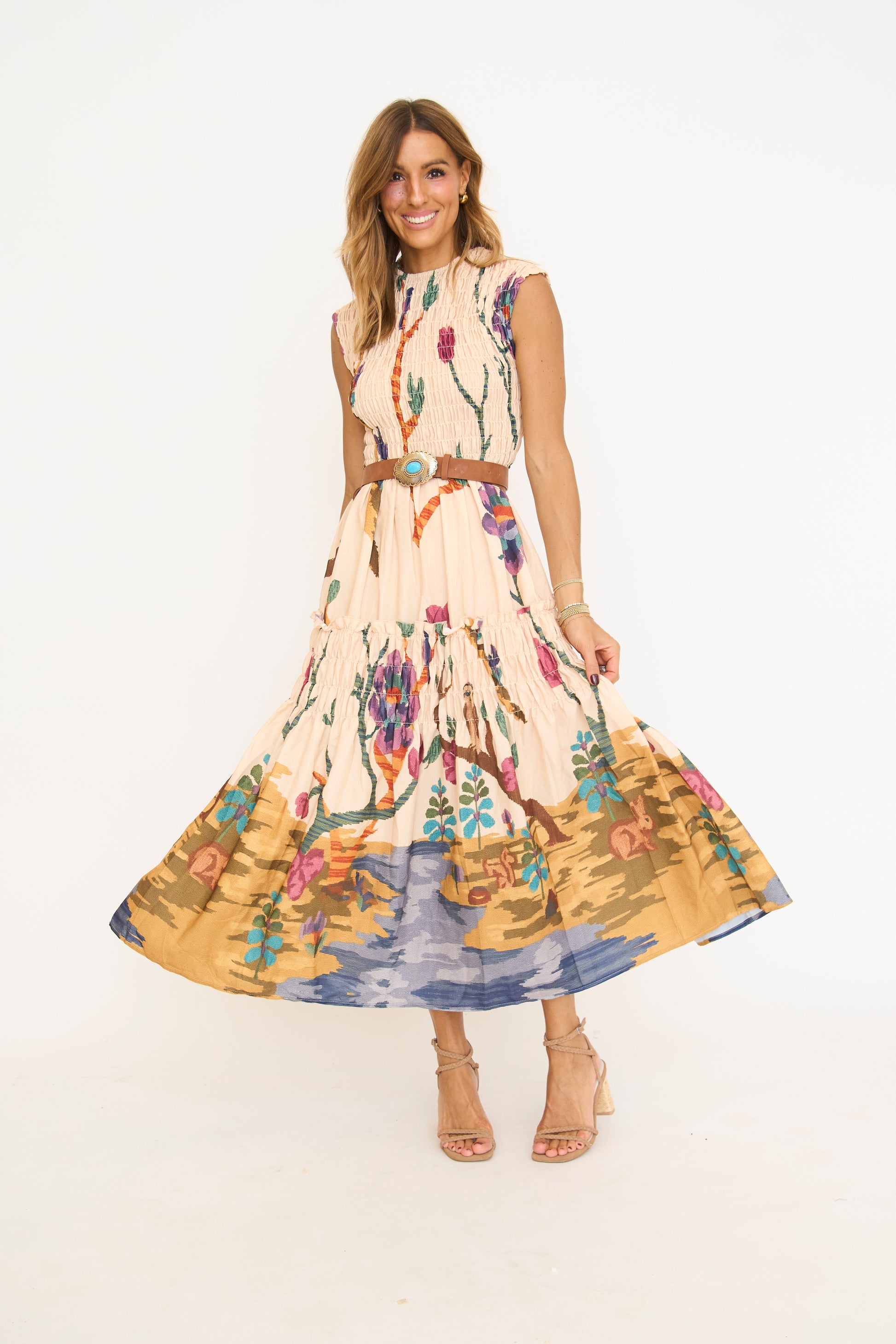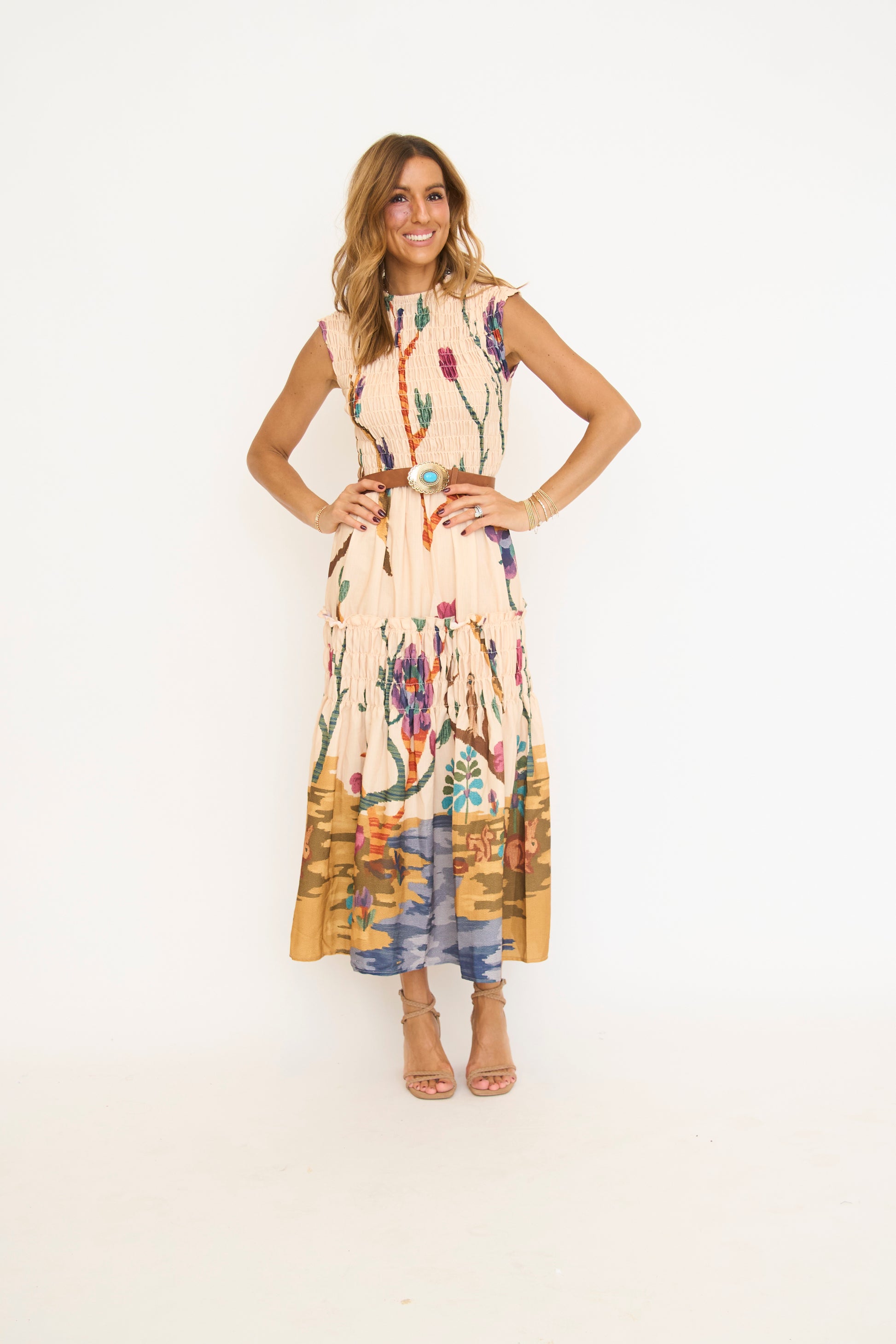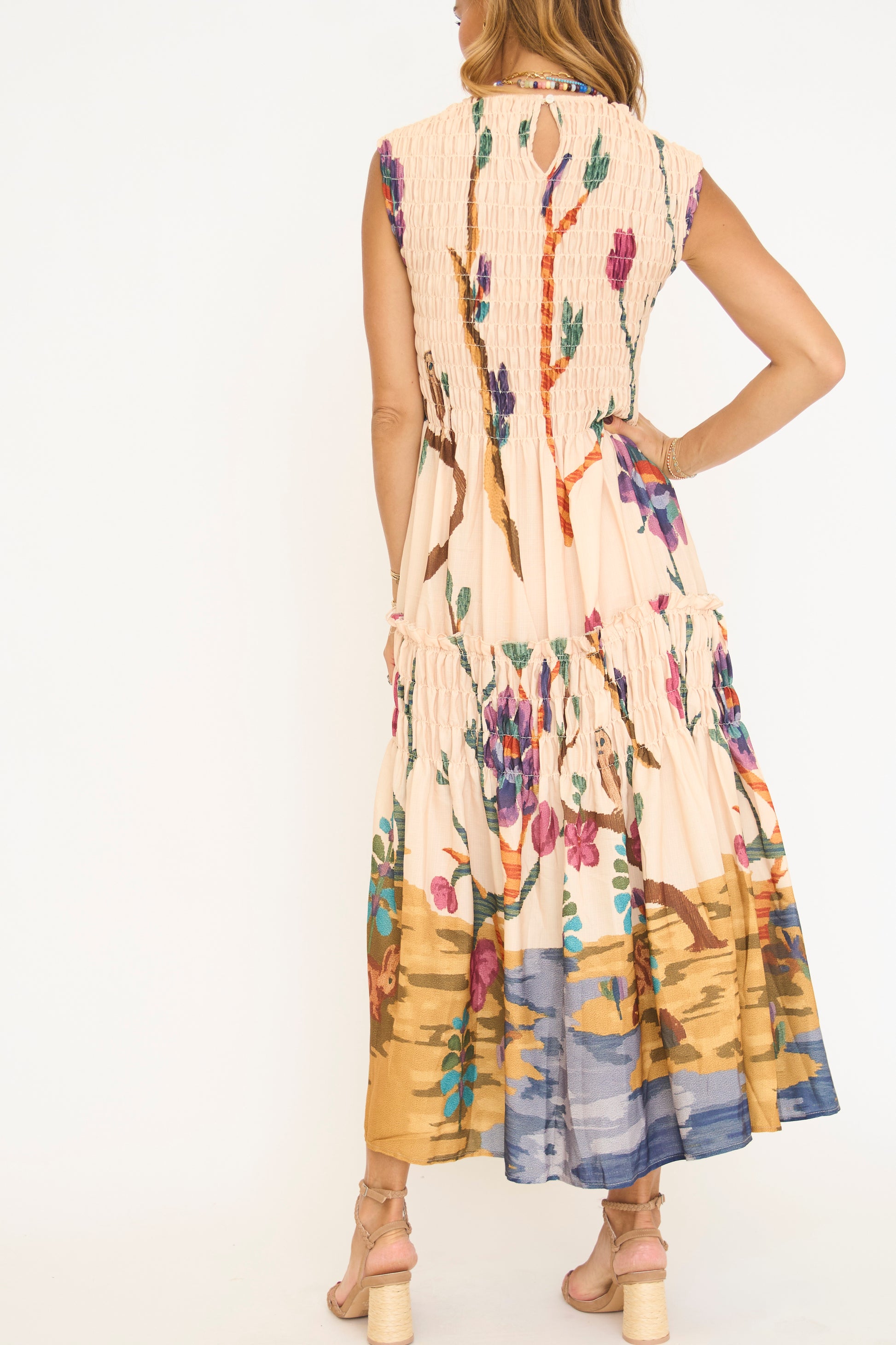 Gorgeous floral print sleeveless smocked maxi dress.