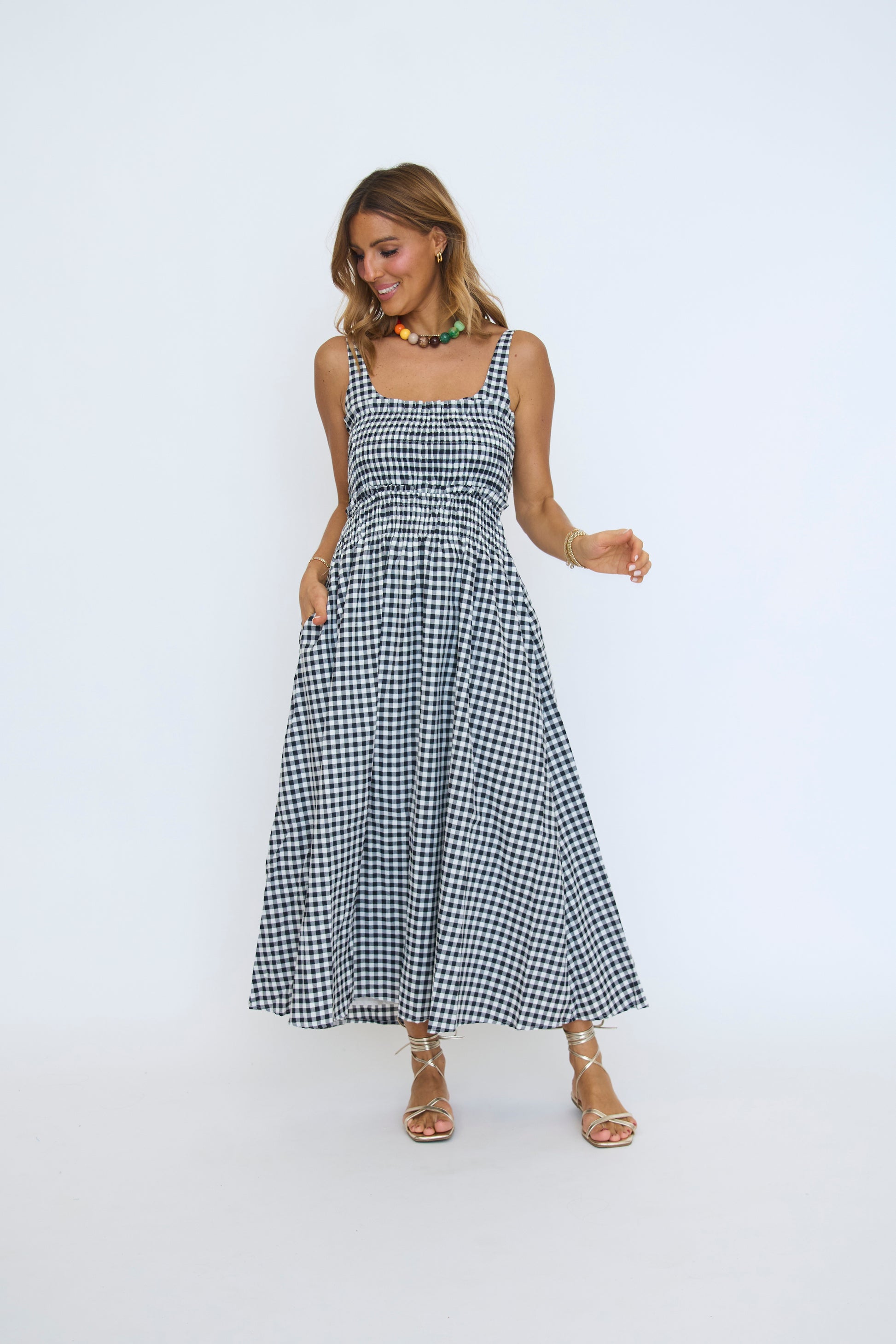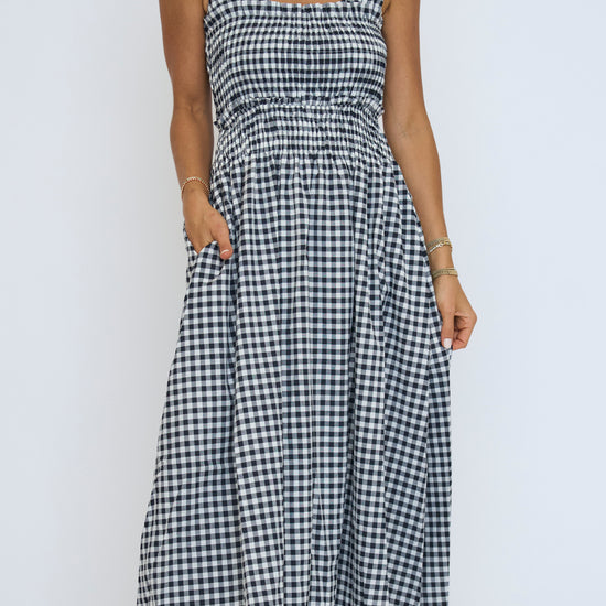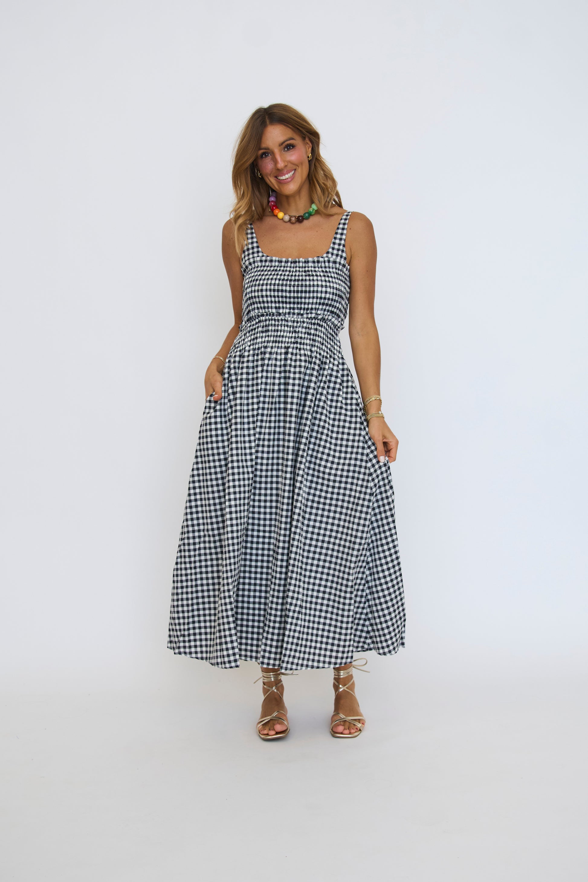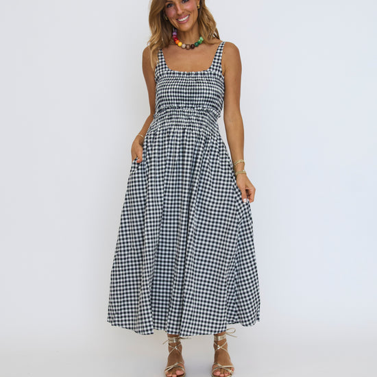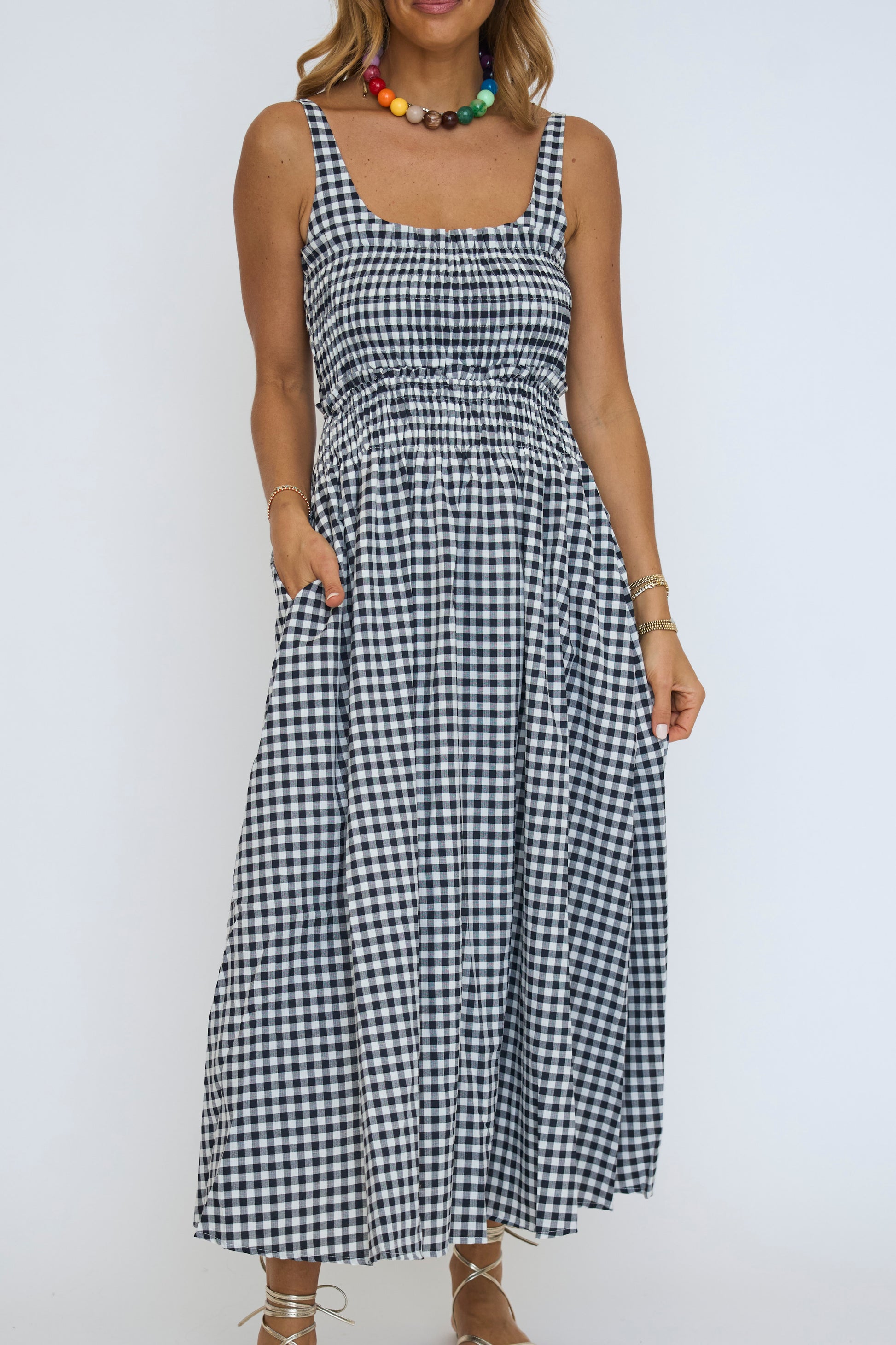 Gingham midi dress featuring a smocked bodice and pockets at the side seams. Fully lined for a smooth fit and added comfort.