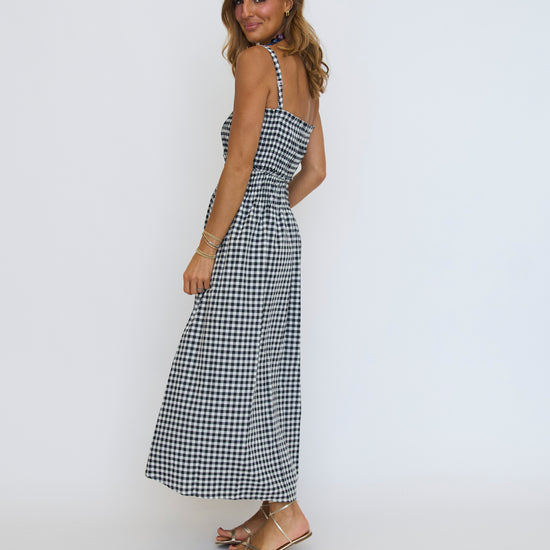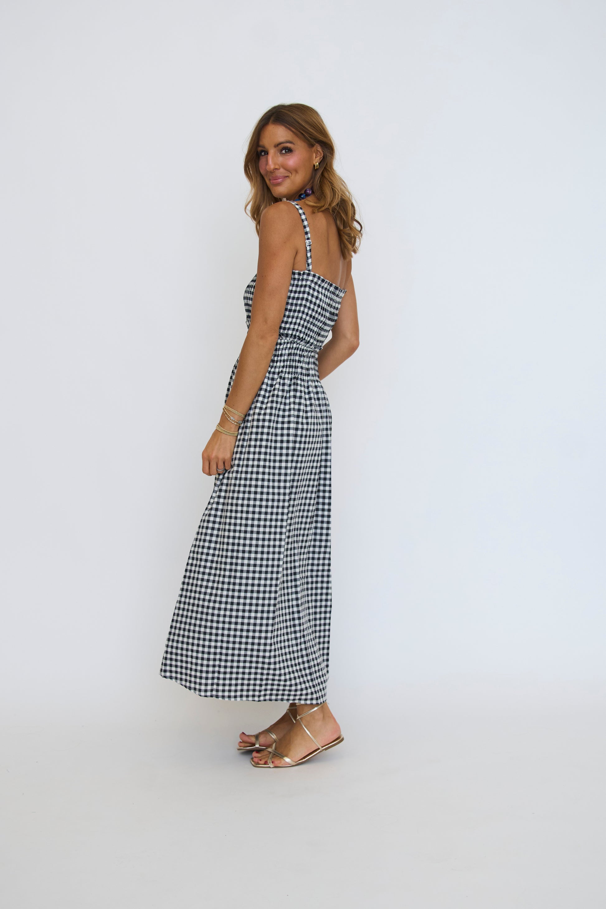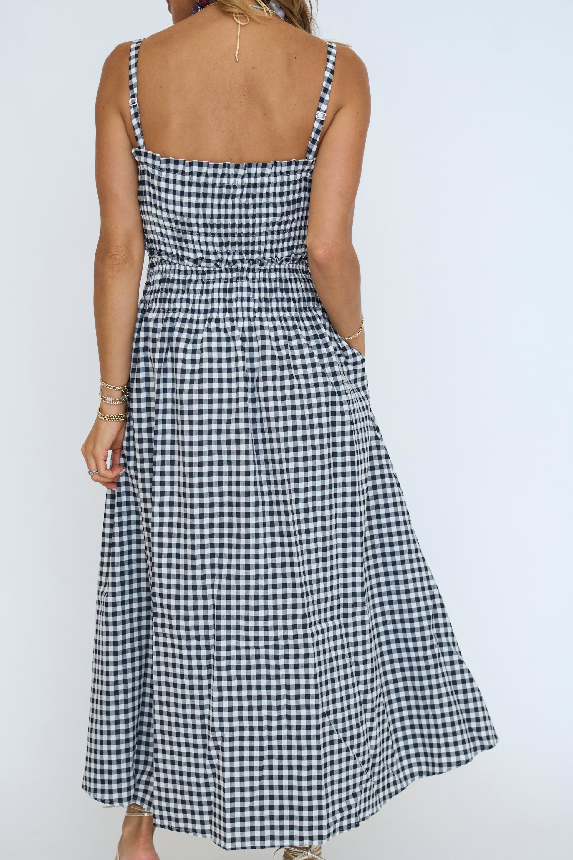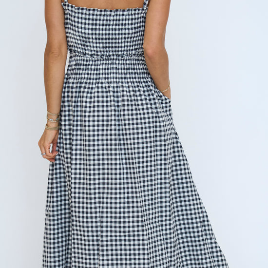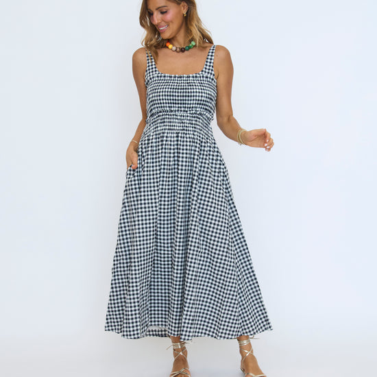 Gingham midi dress featuring a smocked bodice and pockets at the side seams. Fully lined for a smooth fit and added comfort.