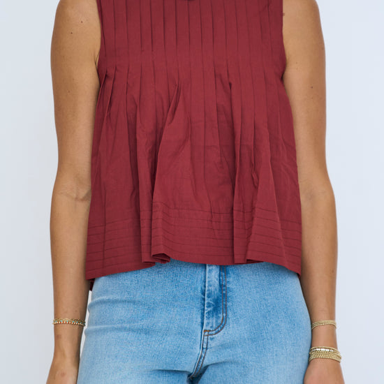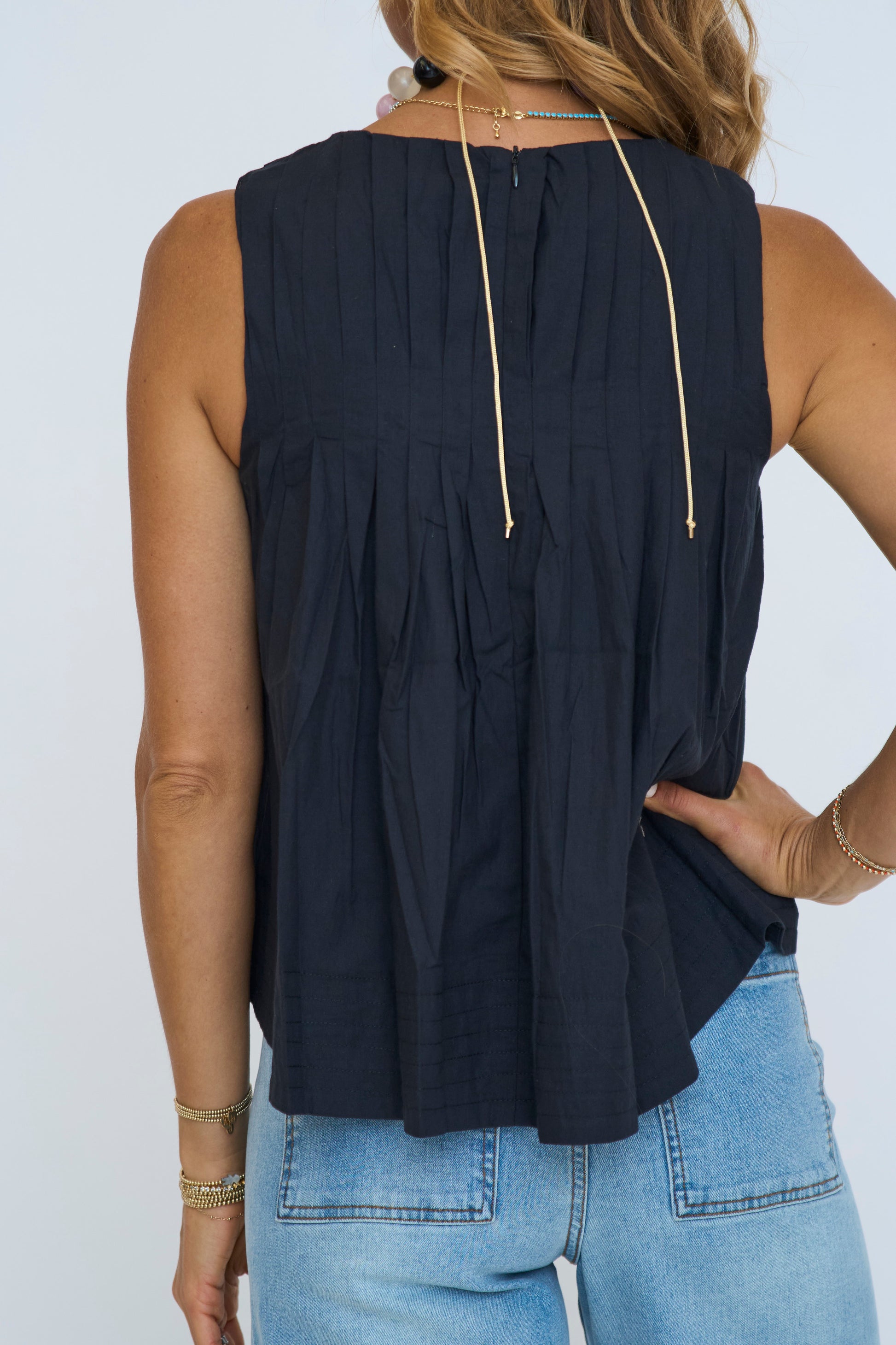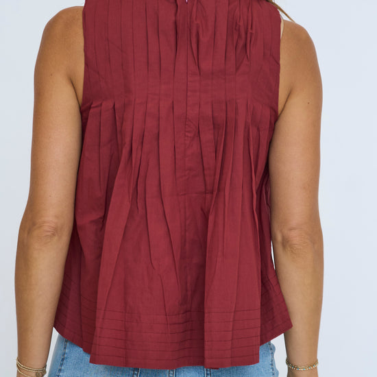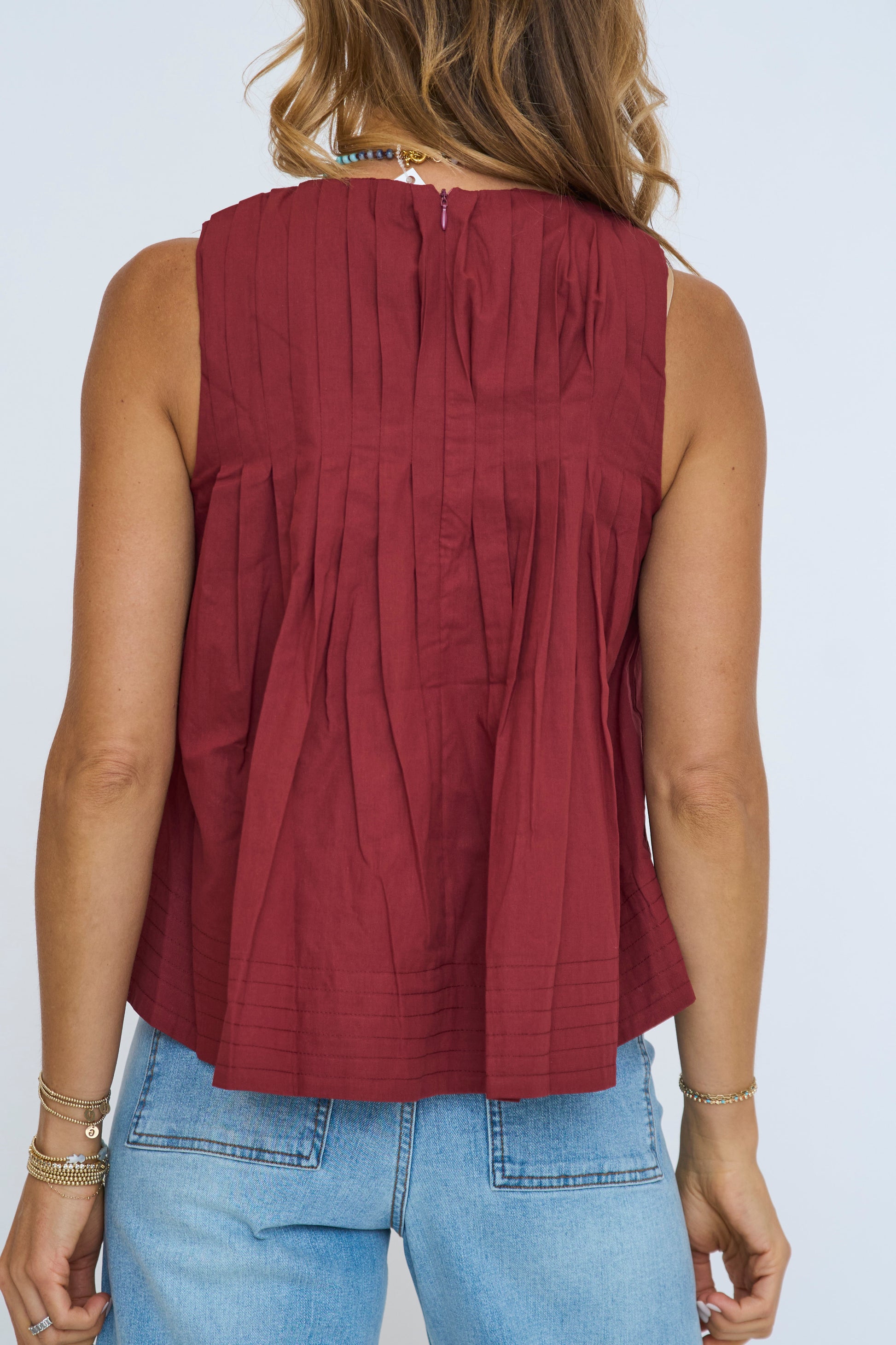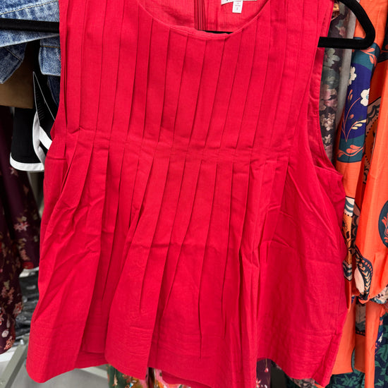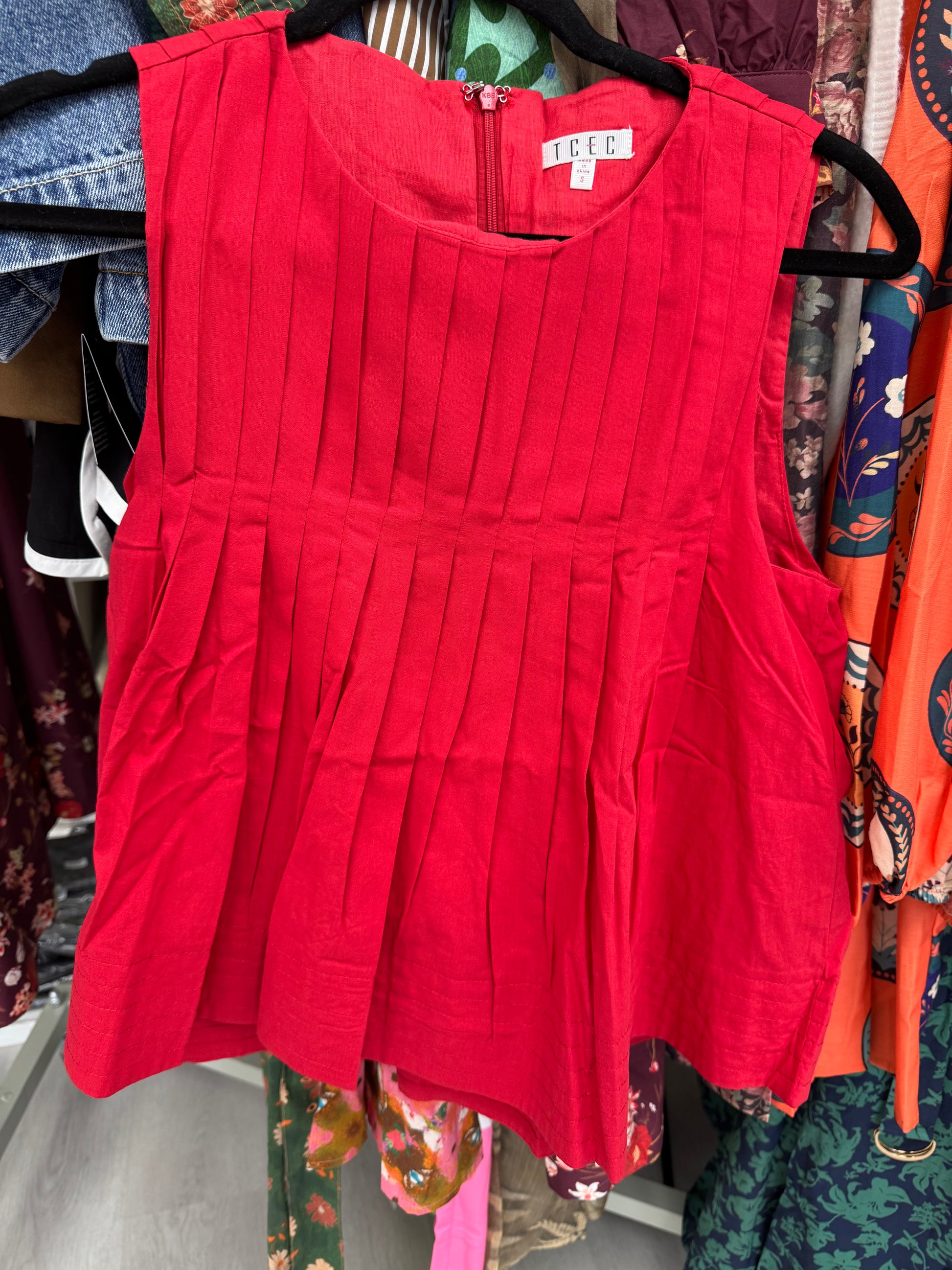 High-low sleeveless top with pleated detailing and concealed back zipper.
