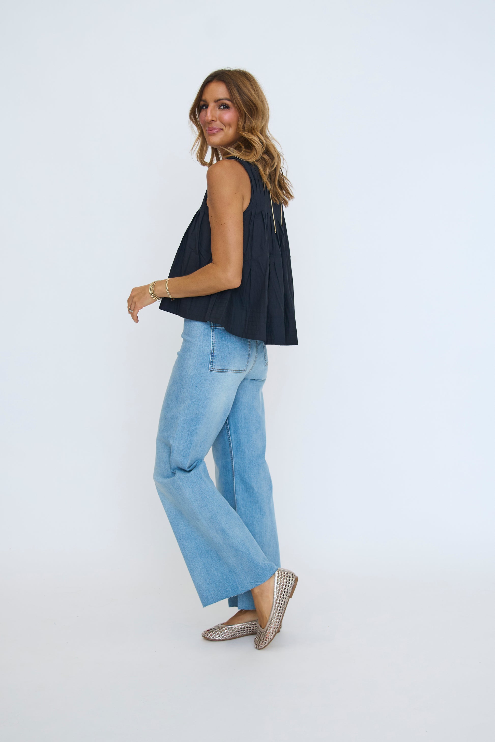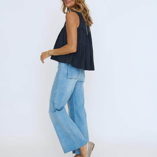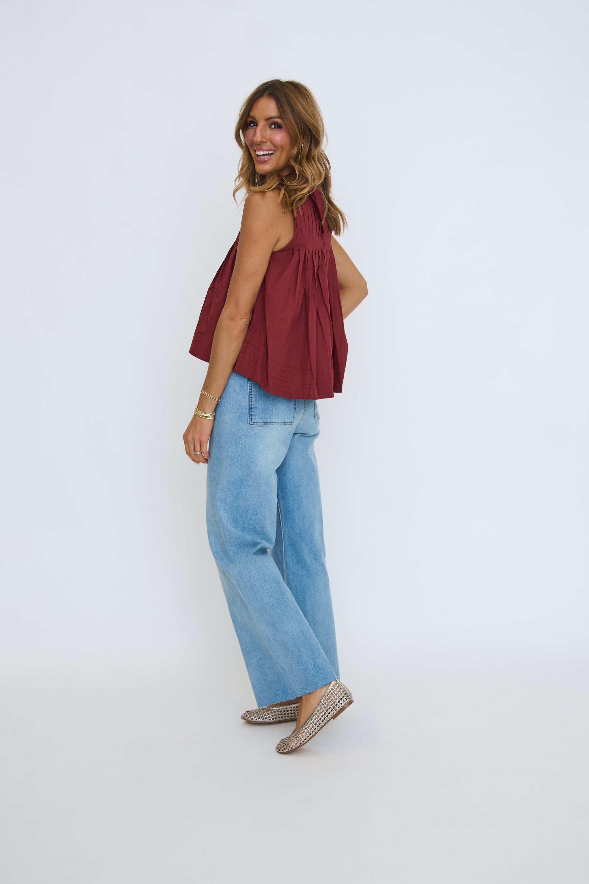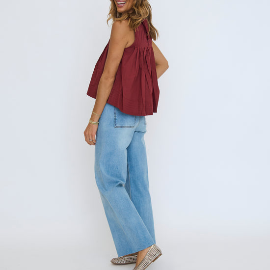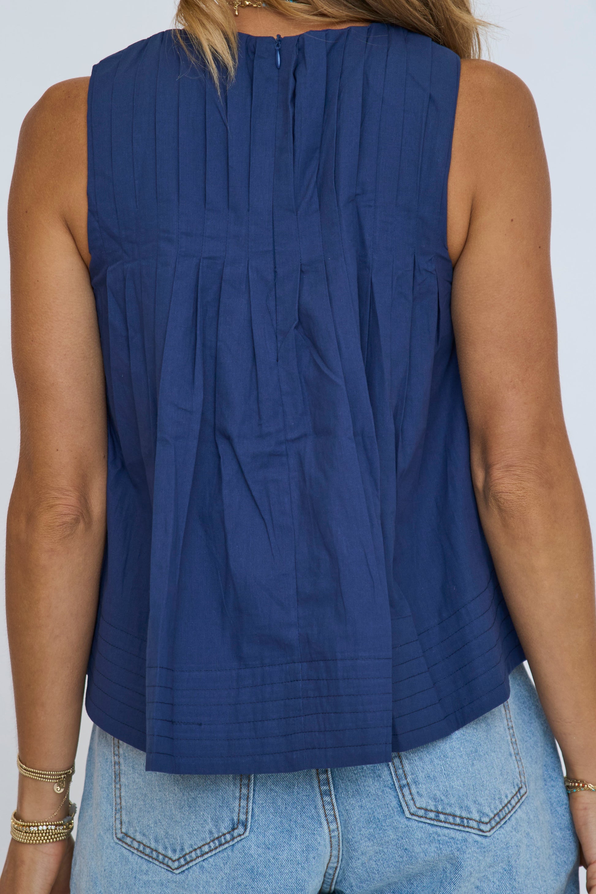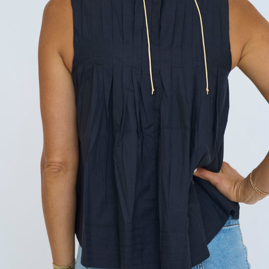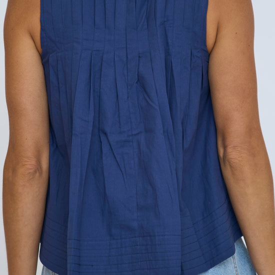 High-low sleeveless top with pleated detailing and concealed back zipper.