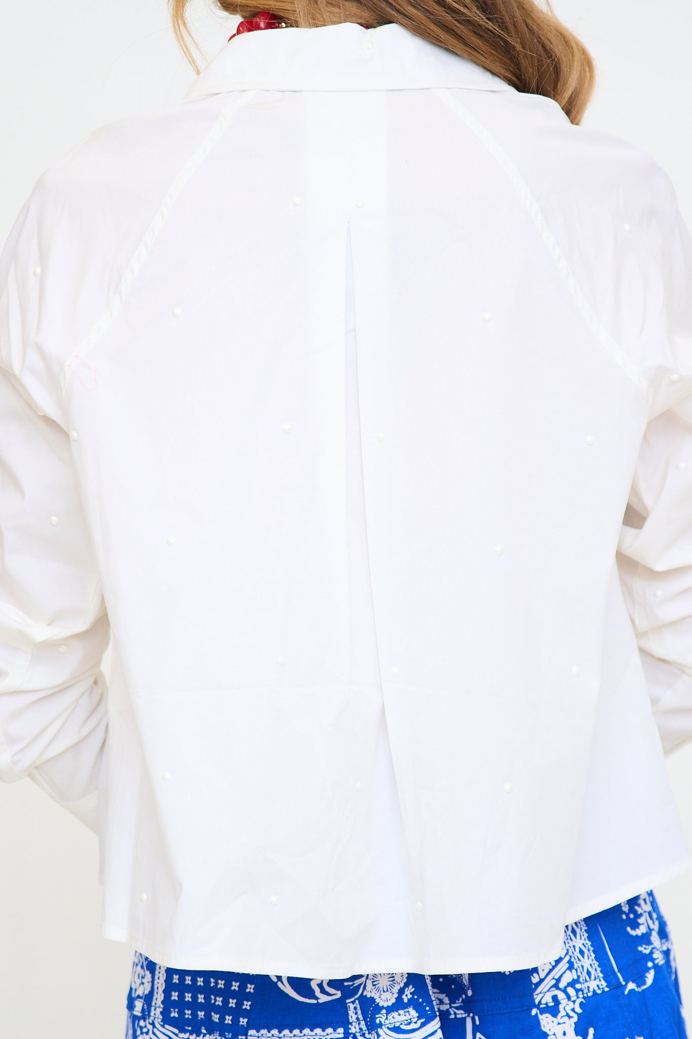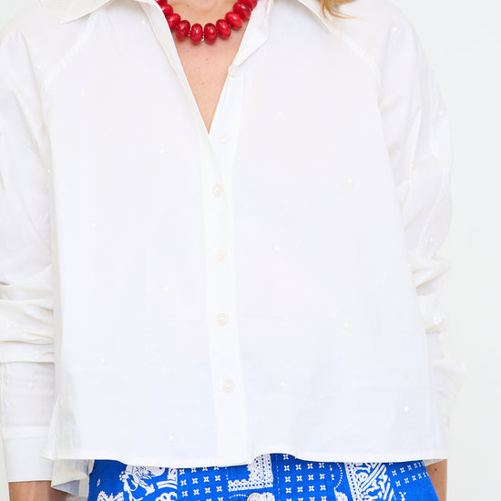 Pop it with pearls, this white blouse is accented by pearl details all over.