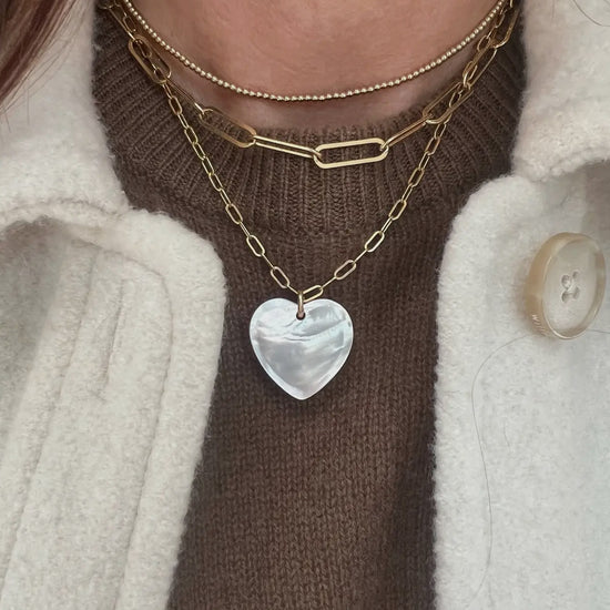 One inch flat acrylic pearl pendant on 14k gold filled box chain