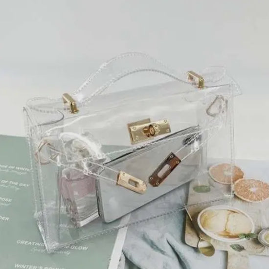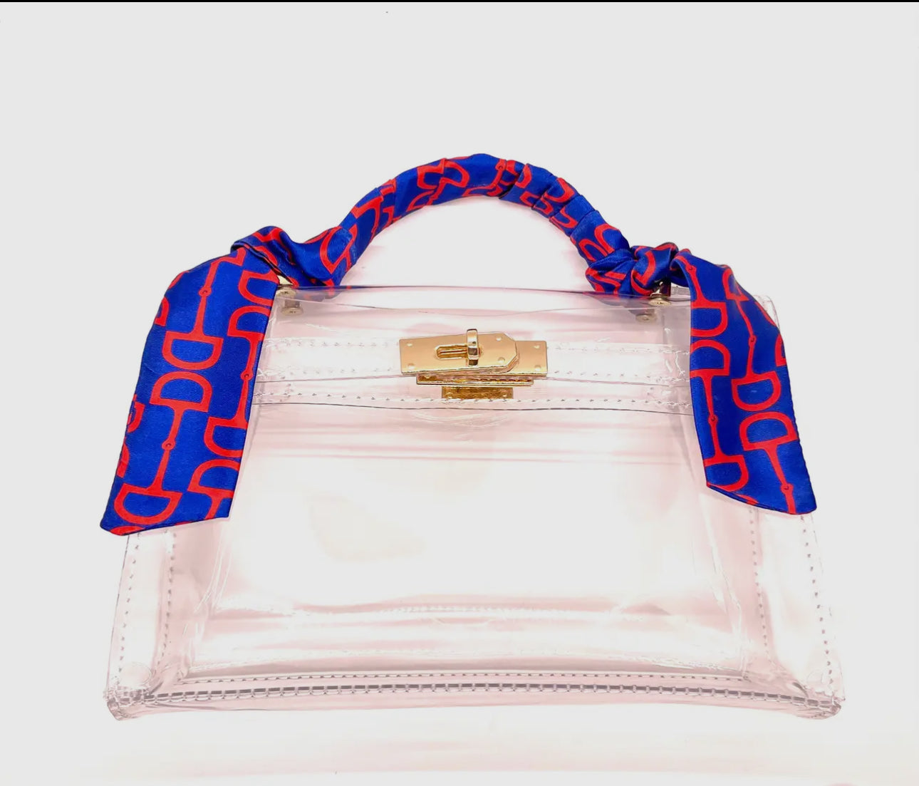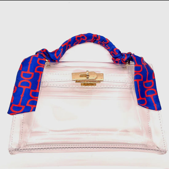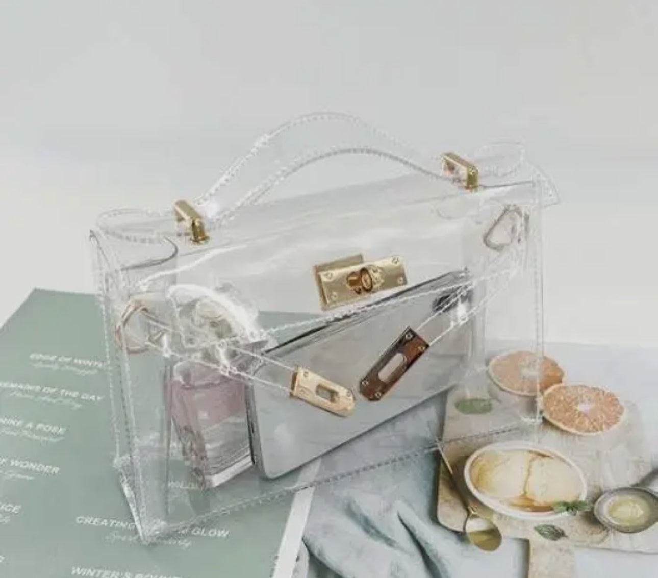 This sophisticated bag gives a nod to the iconic Kelly bag.. Gold hardware- comes with a clear cross body strap. bag is 8x5x2