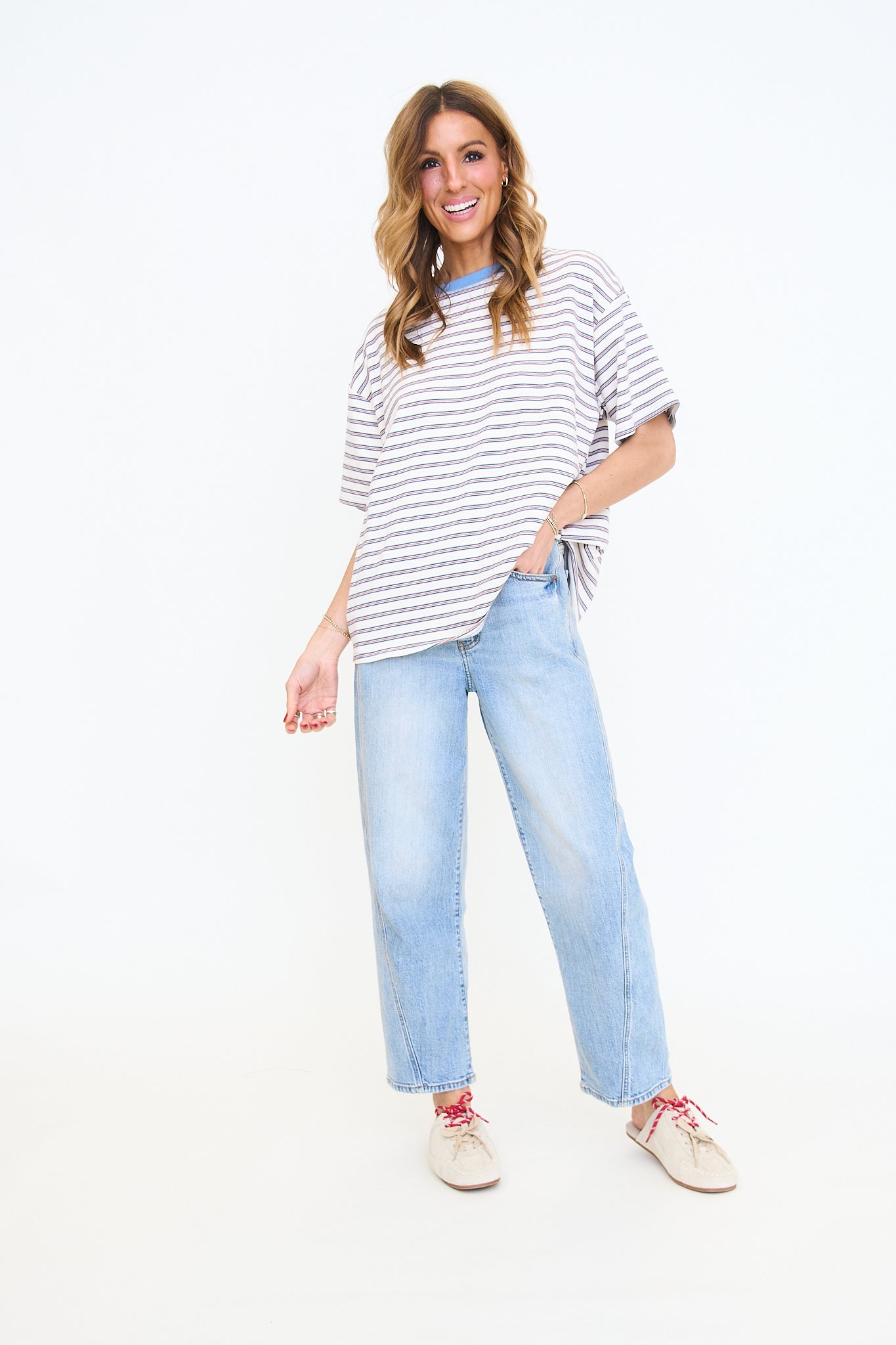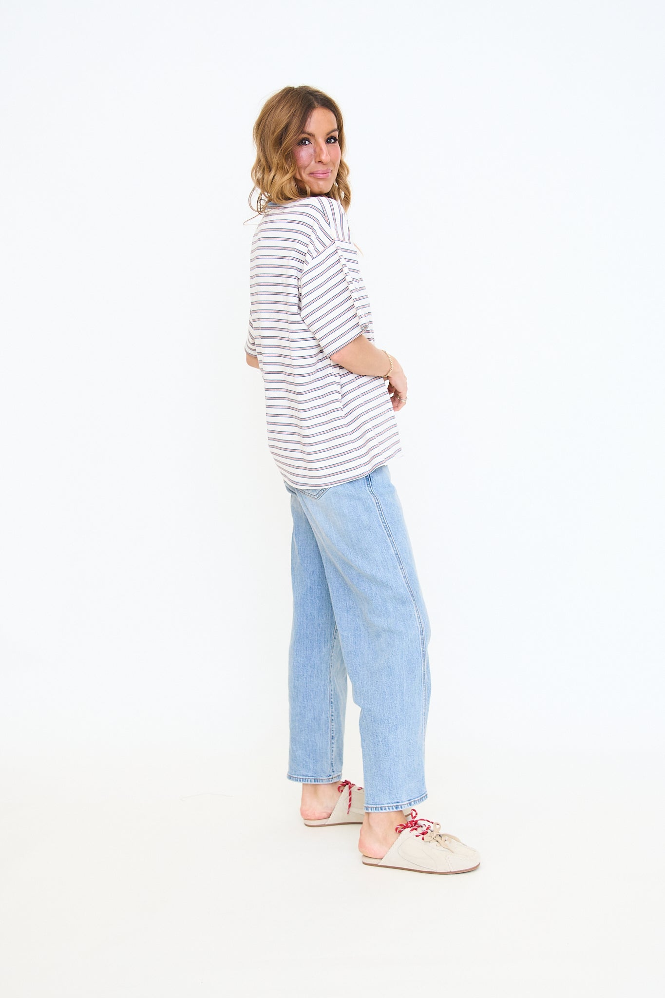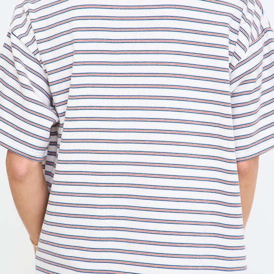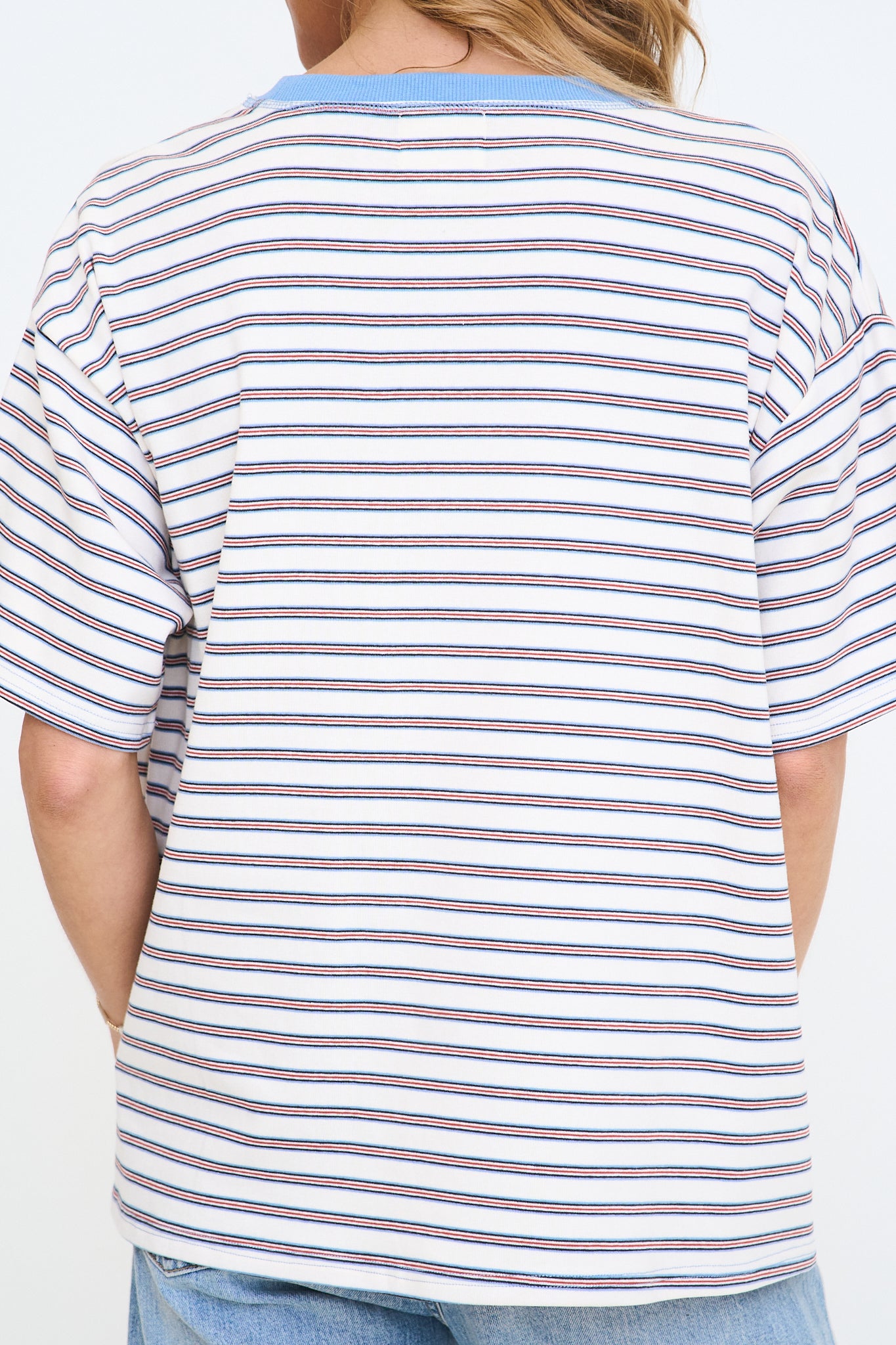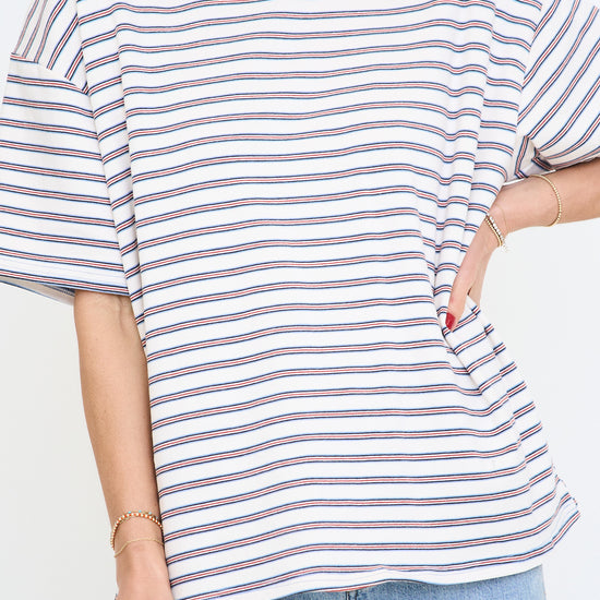 Red, cream, and blue striped oversized t-shirt. Perfect for every day wear. Super soft jersey cotton.