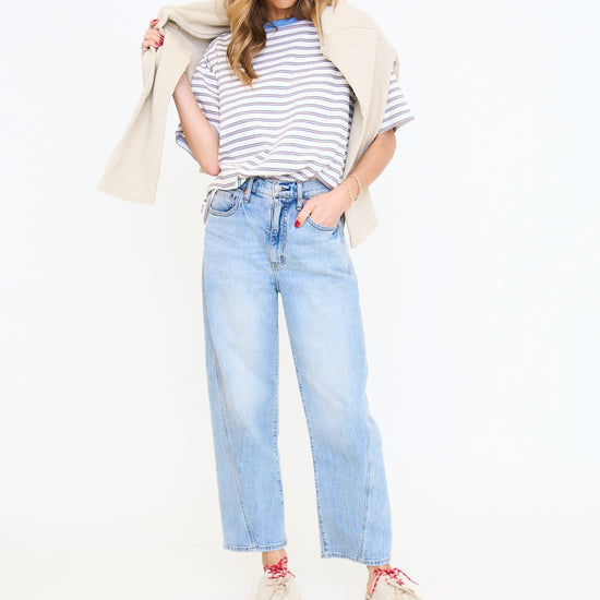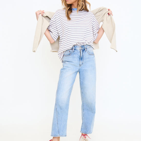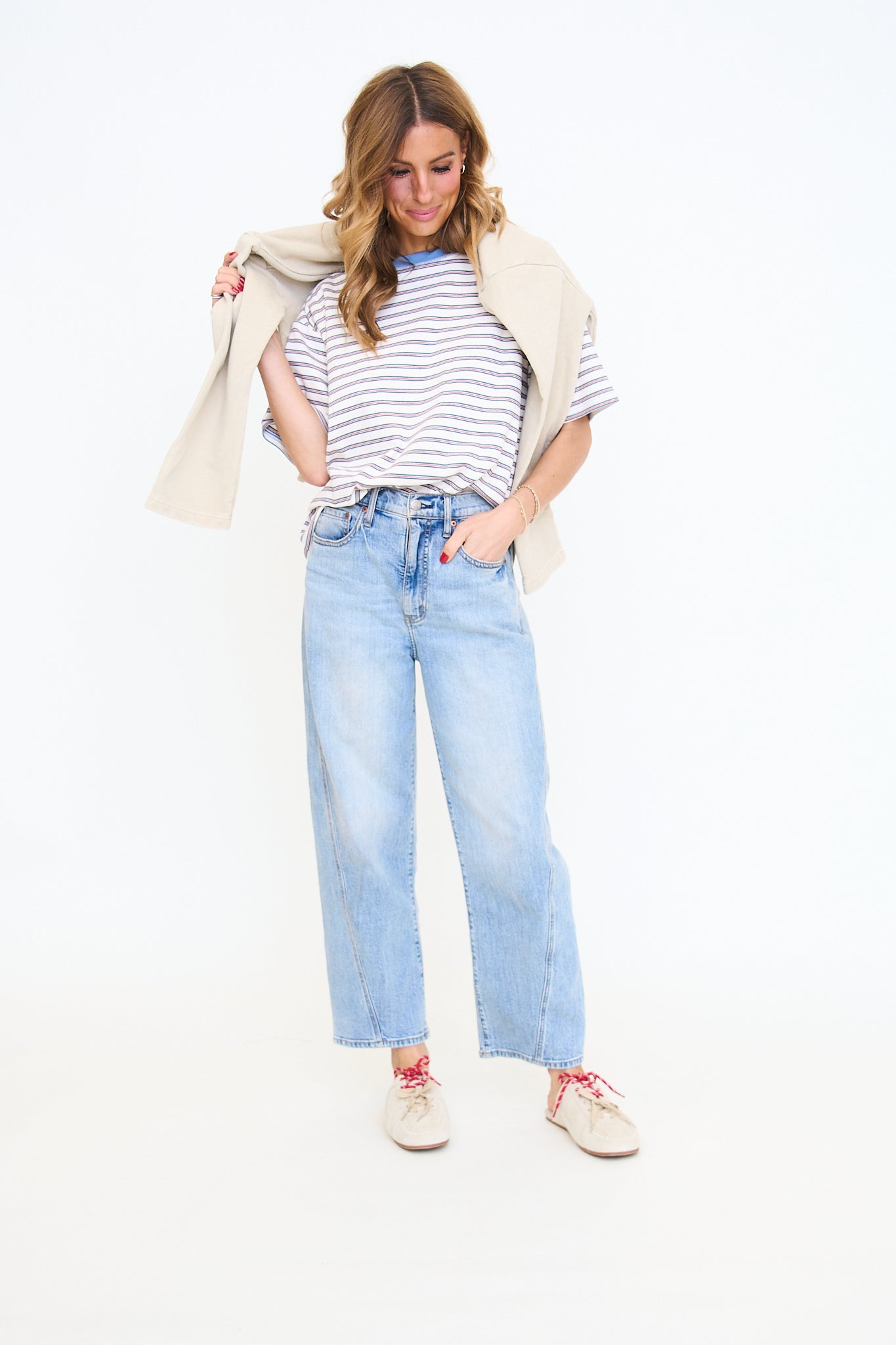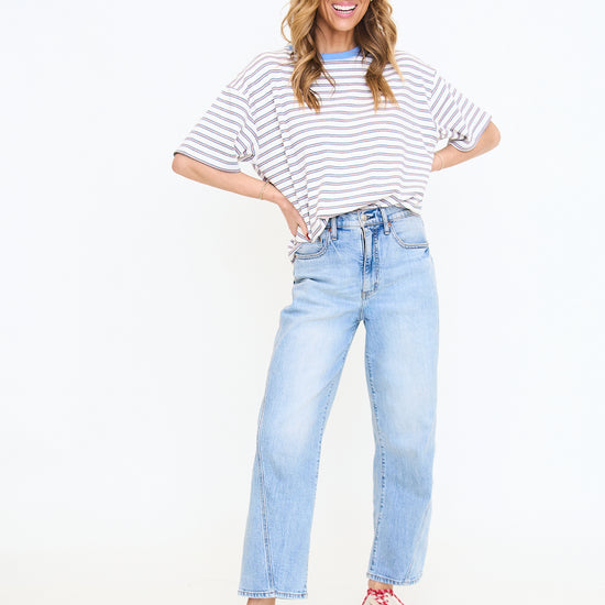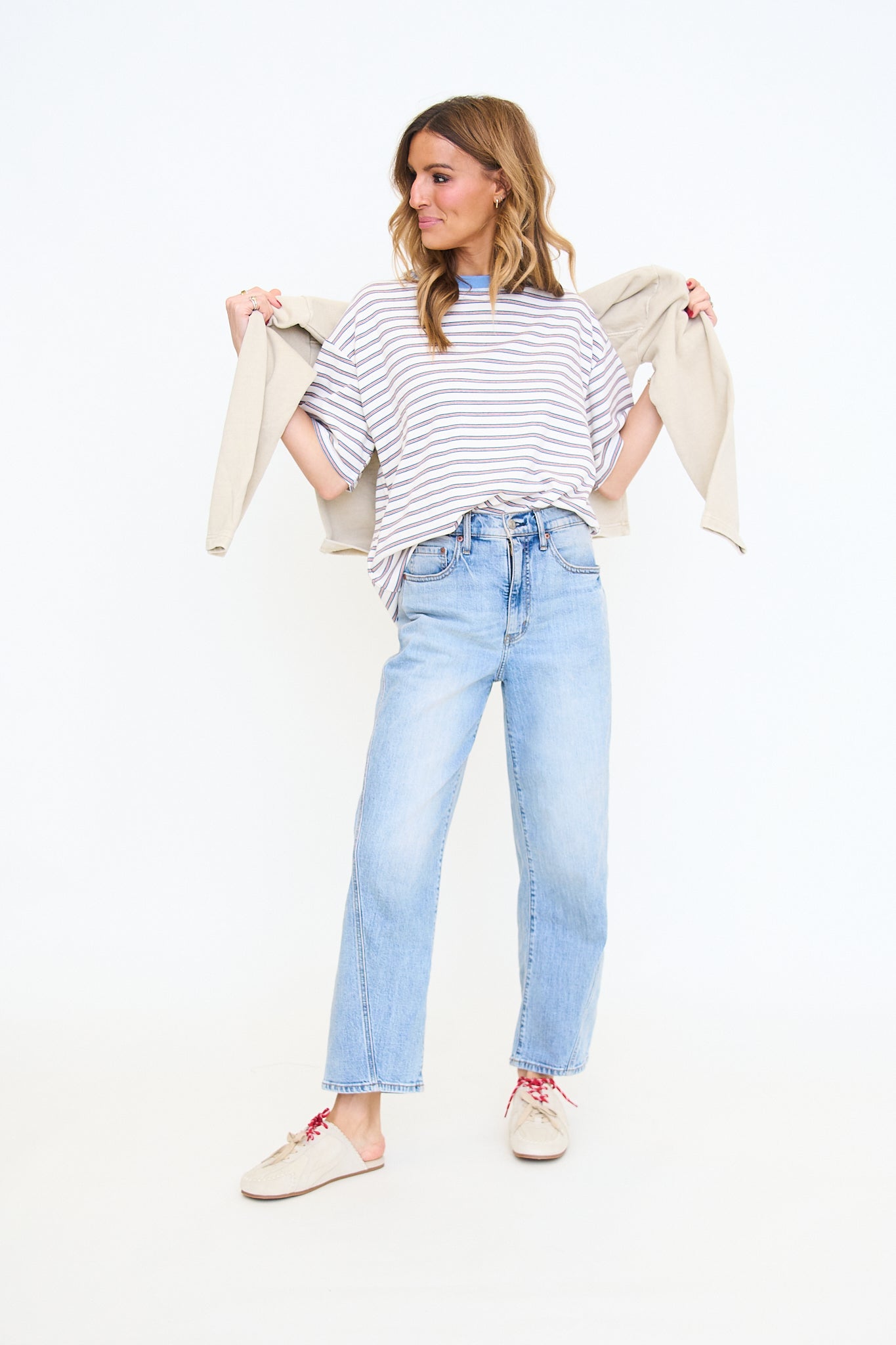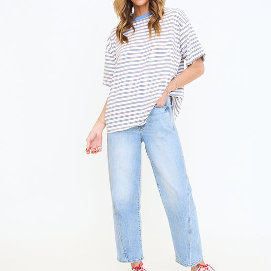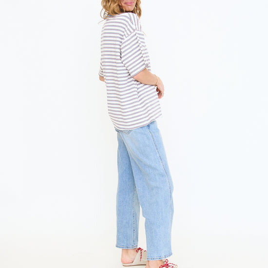 Red, cream, and blue striped oversized t-shirt. Perfect for every day wear. Super soft jersey cotton.