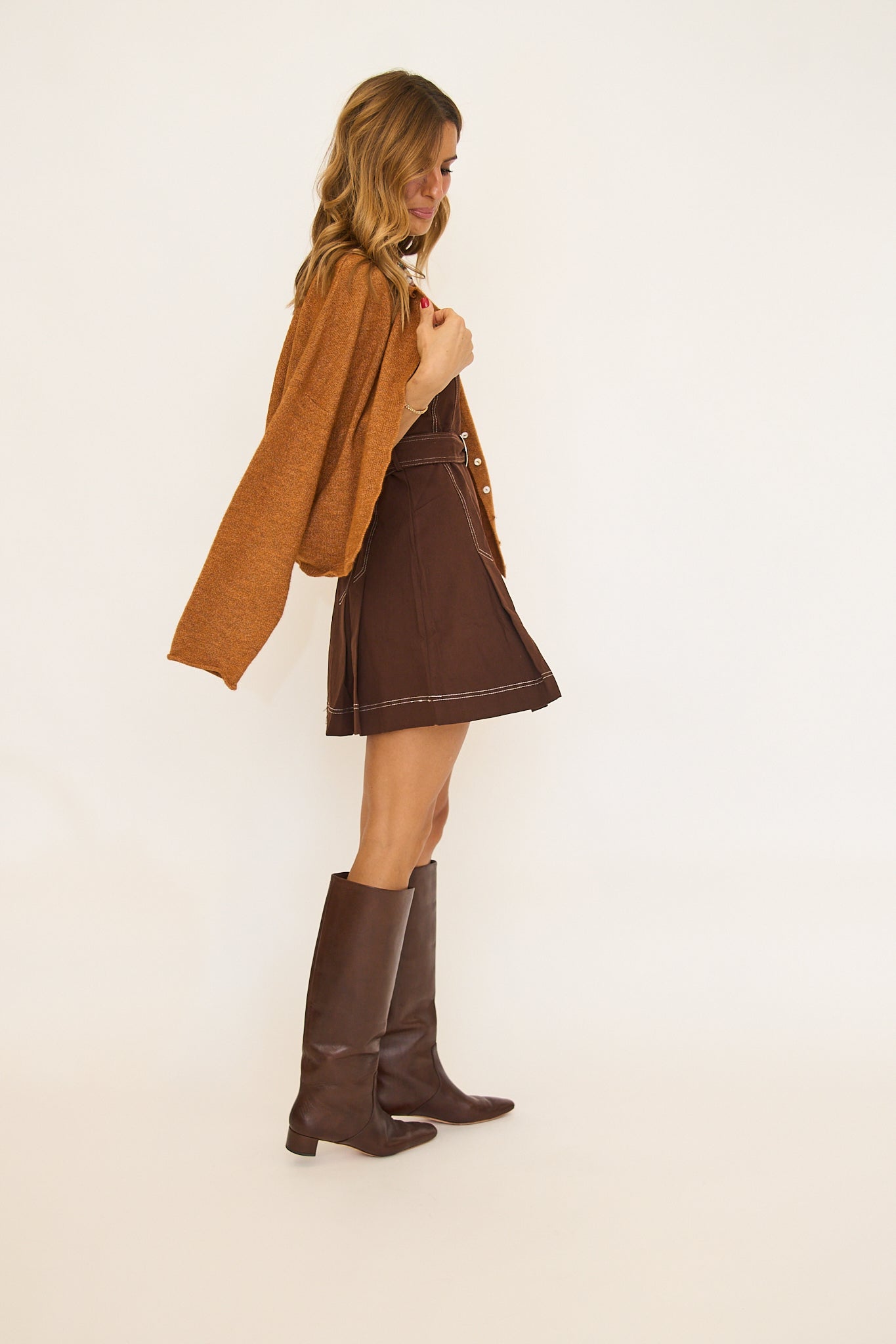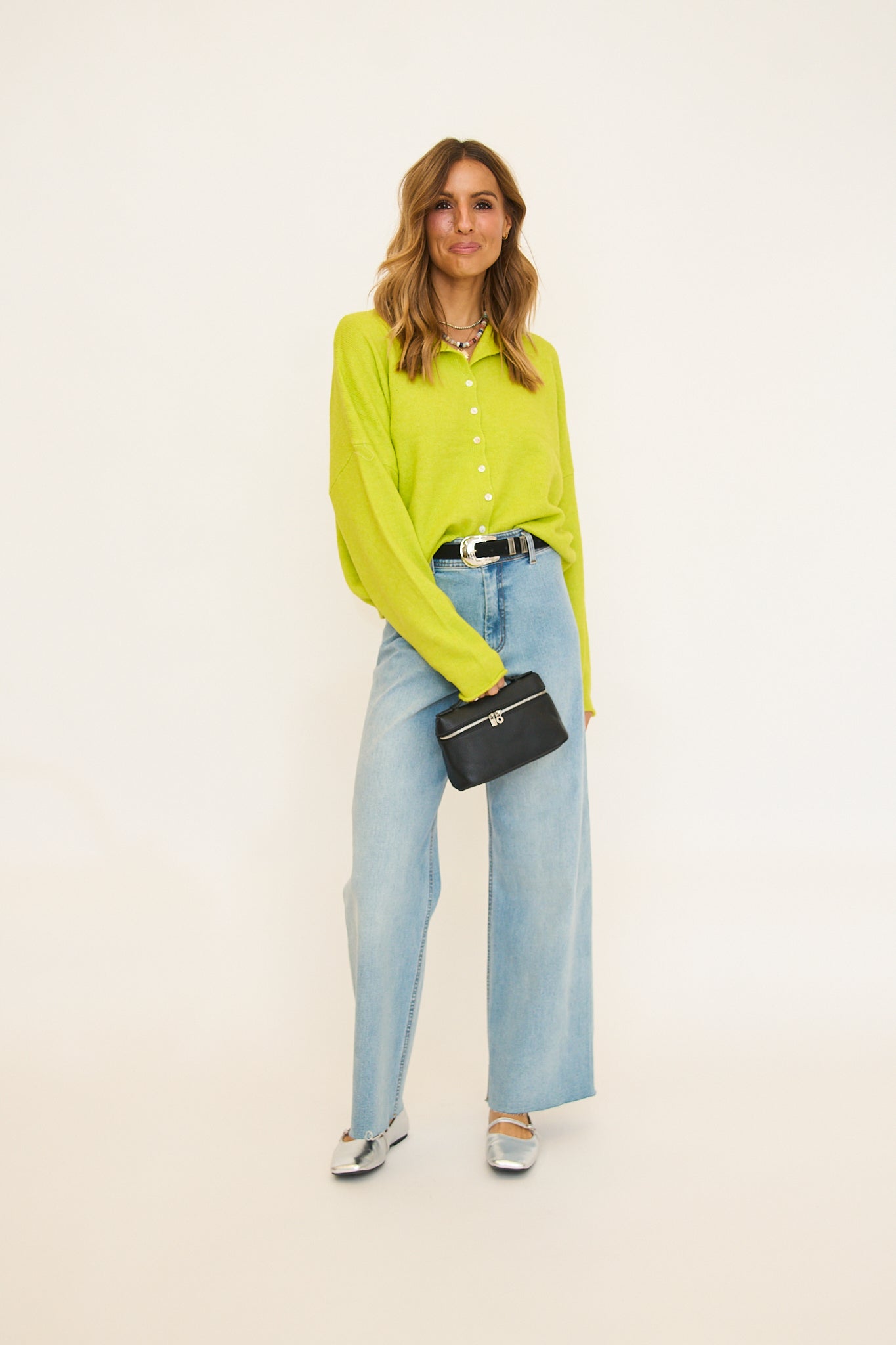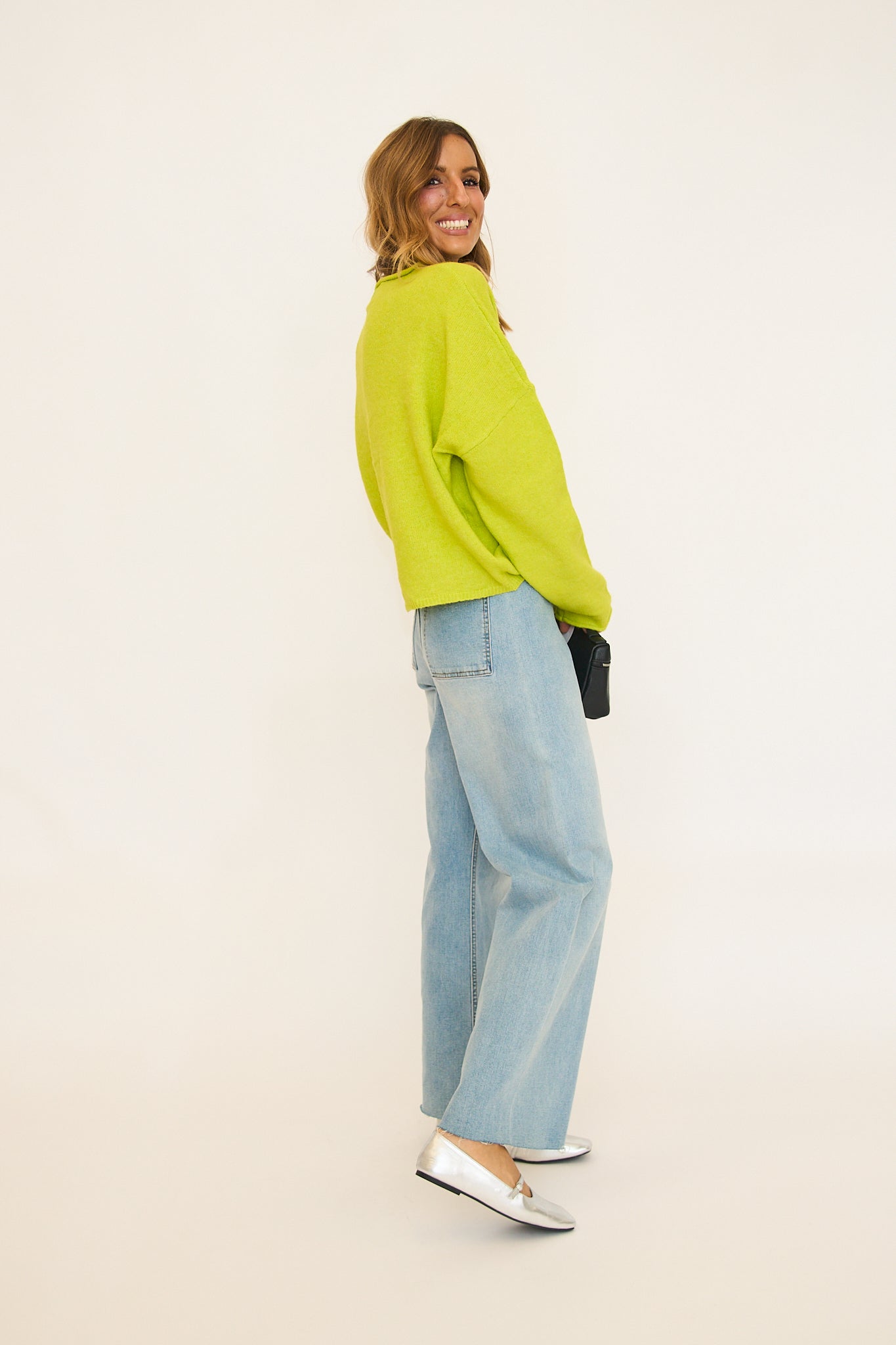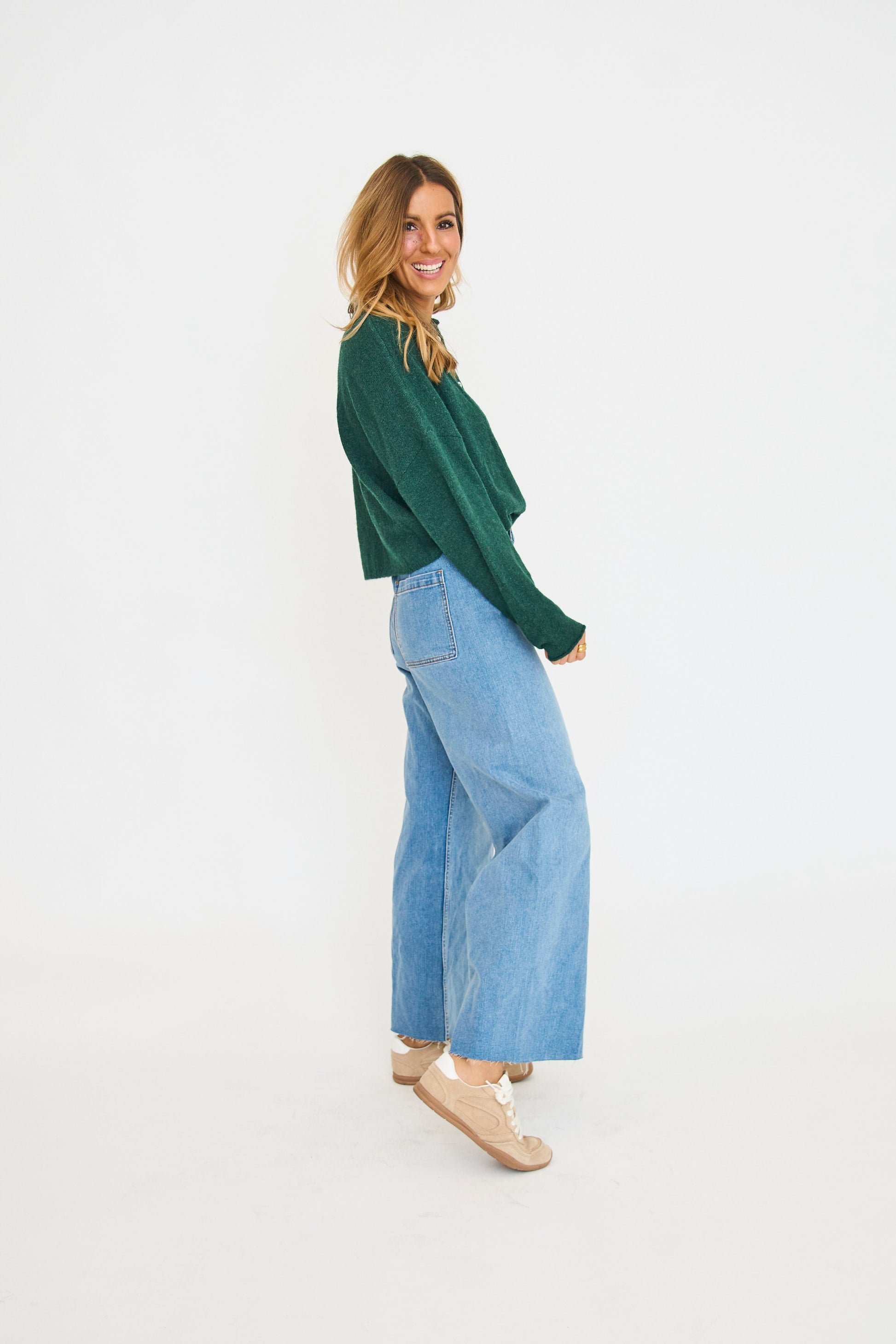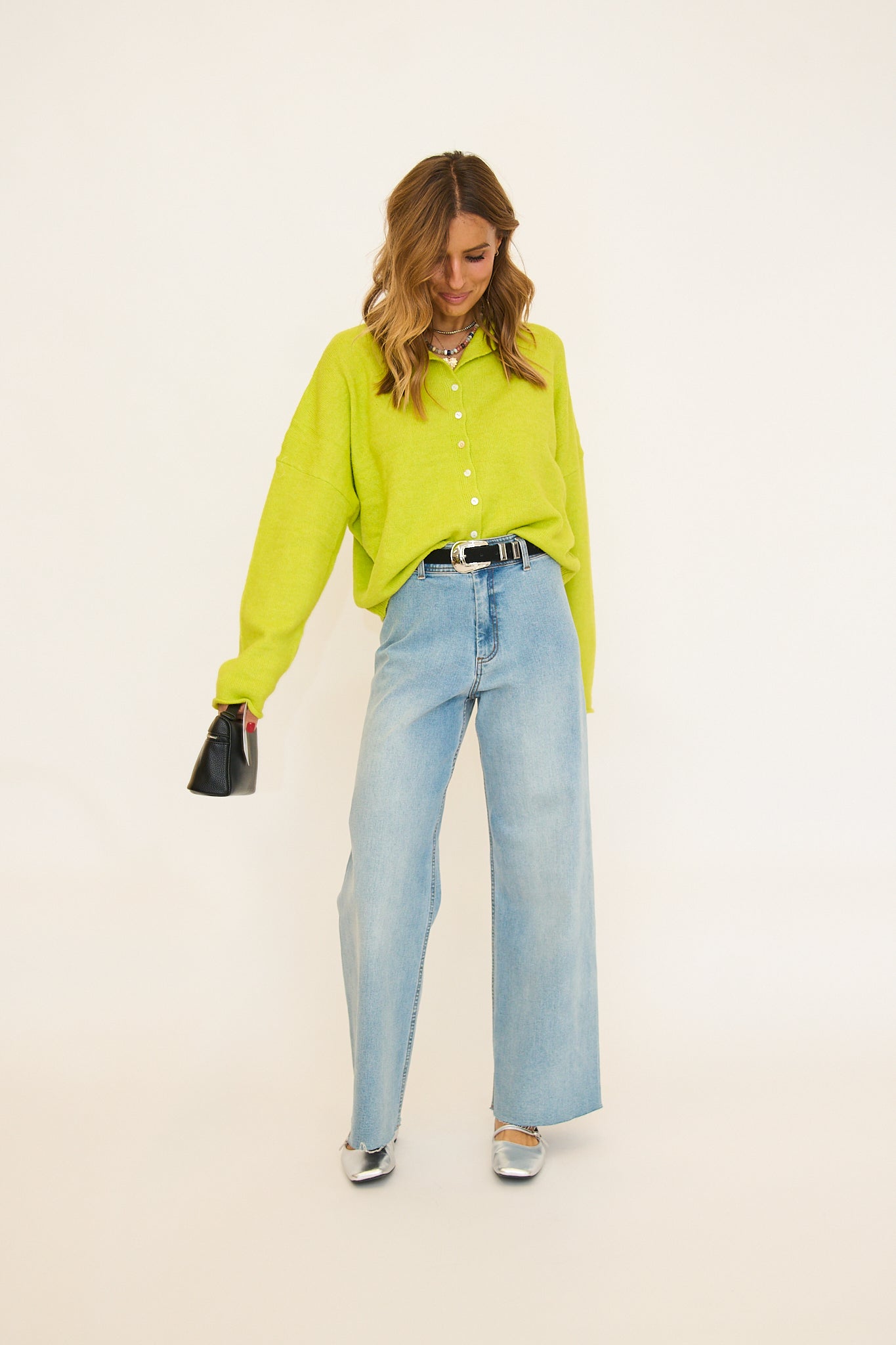 Fit is oversized, Rachel is 5'8" wearing her true size small. Can size down!