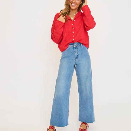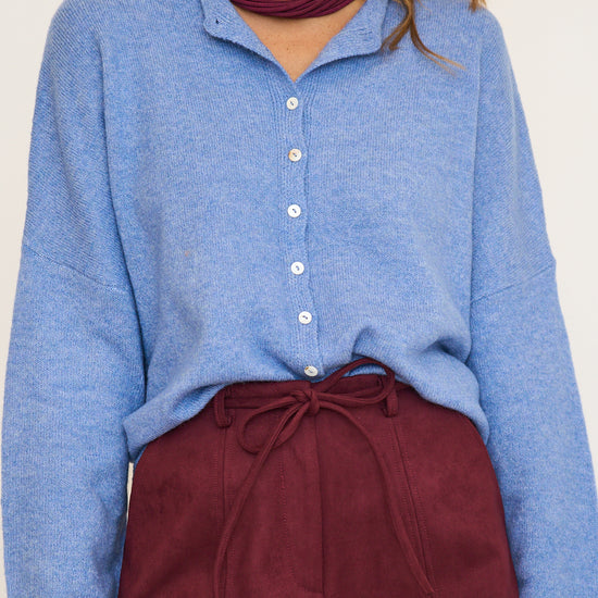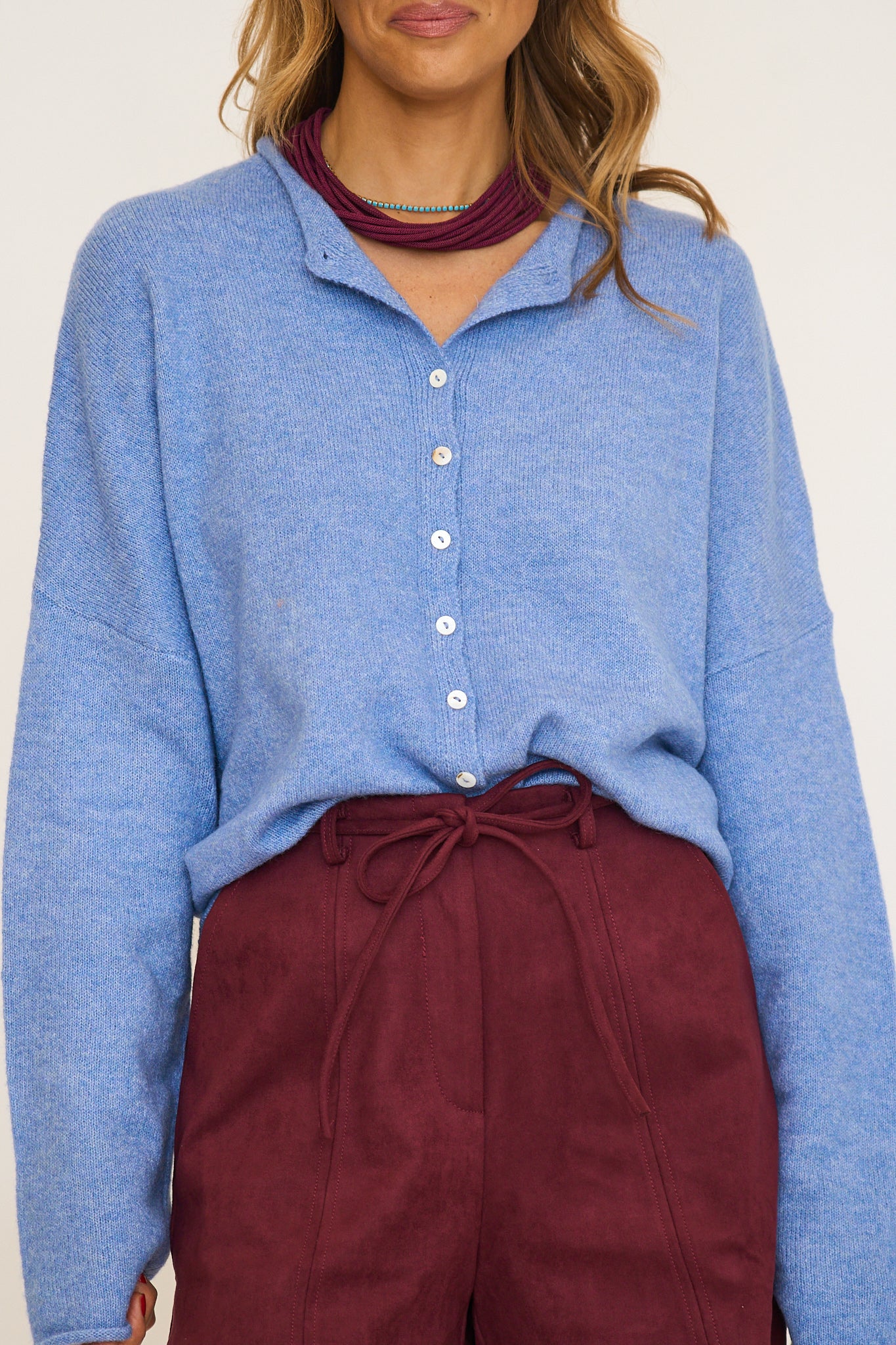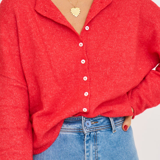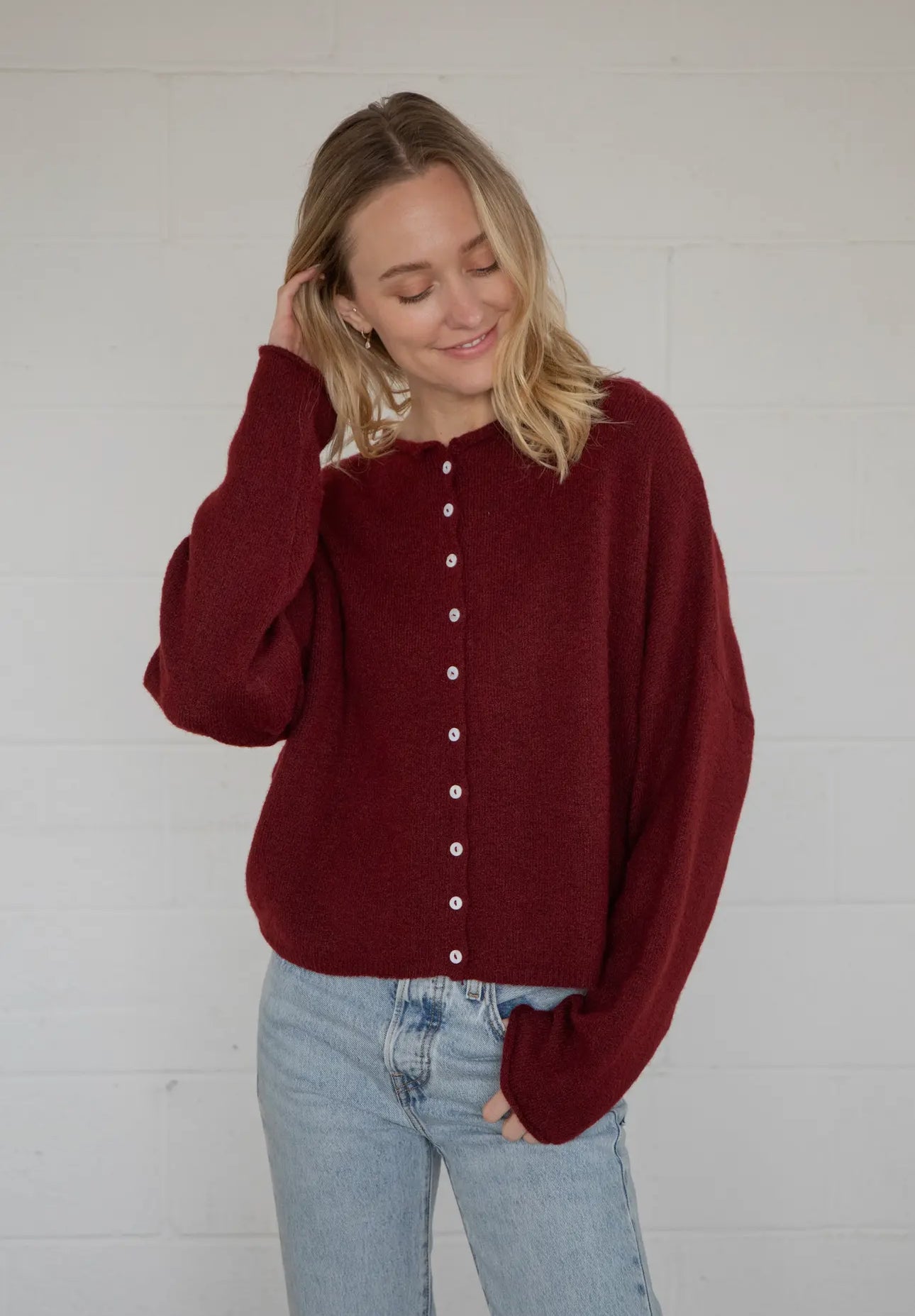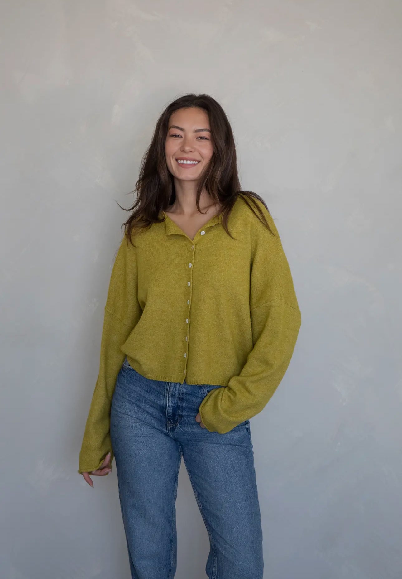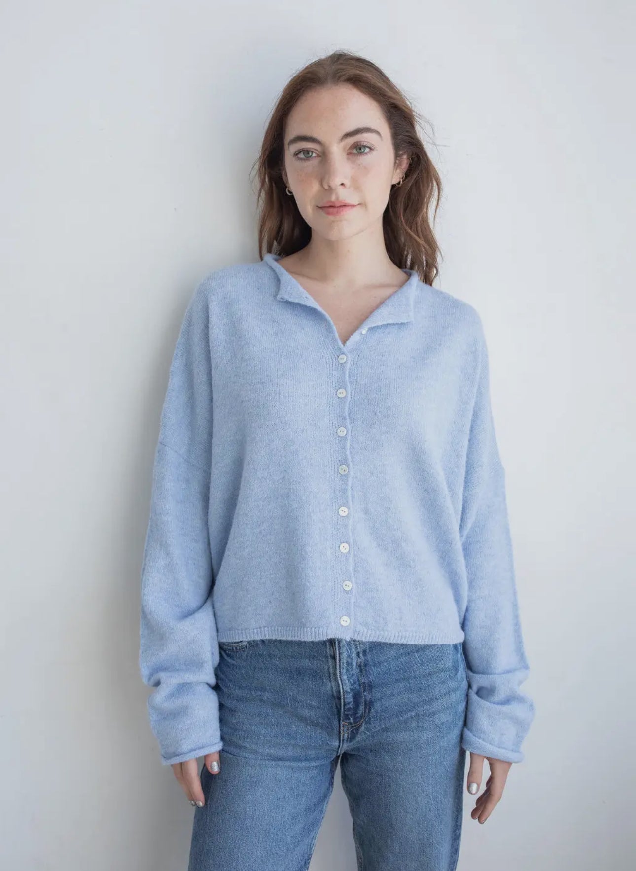 Soft and cozy lightweight cardigan with rolled edge finish on the sleeves and collar.