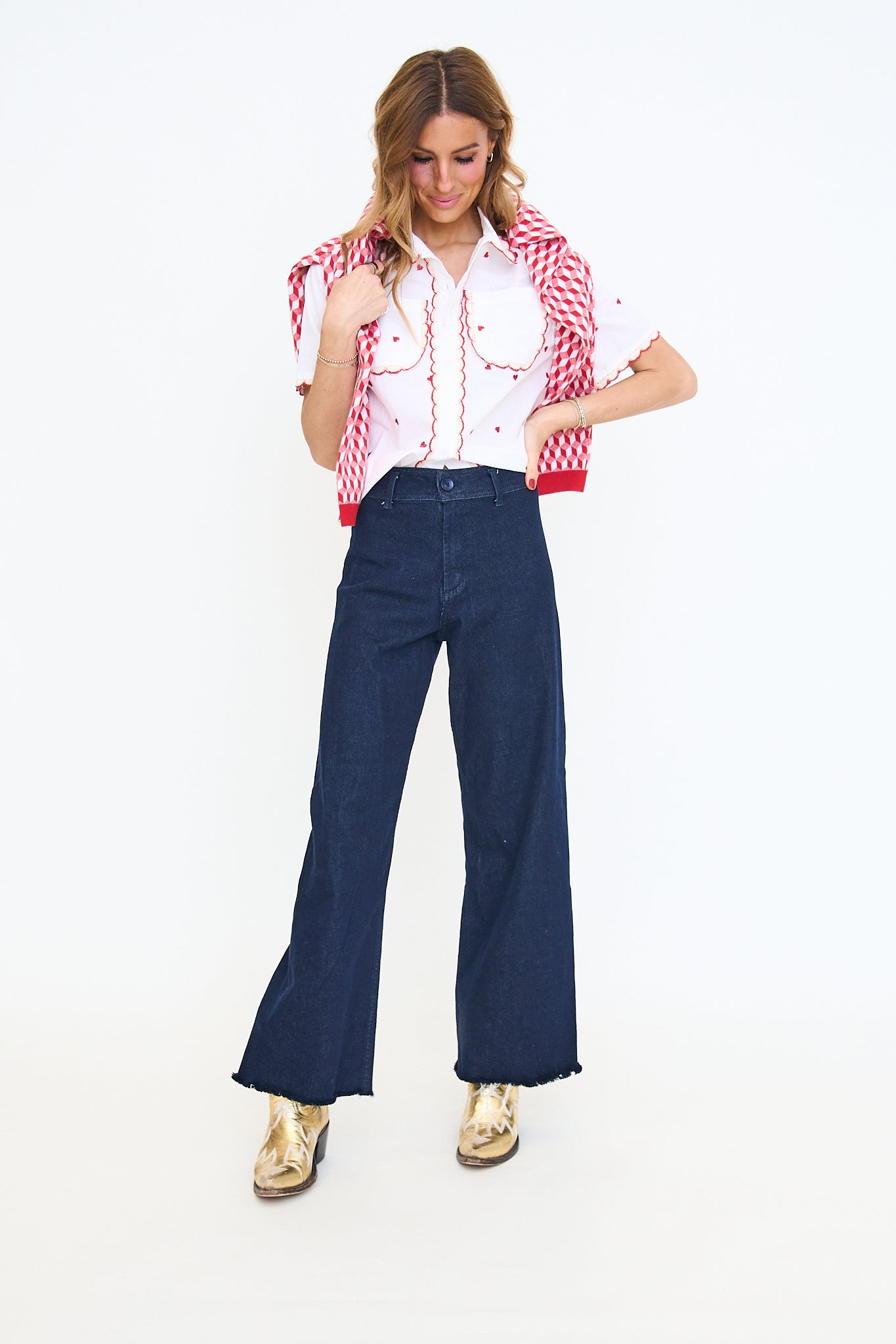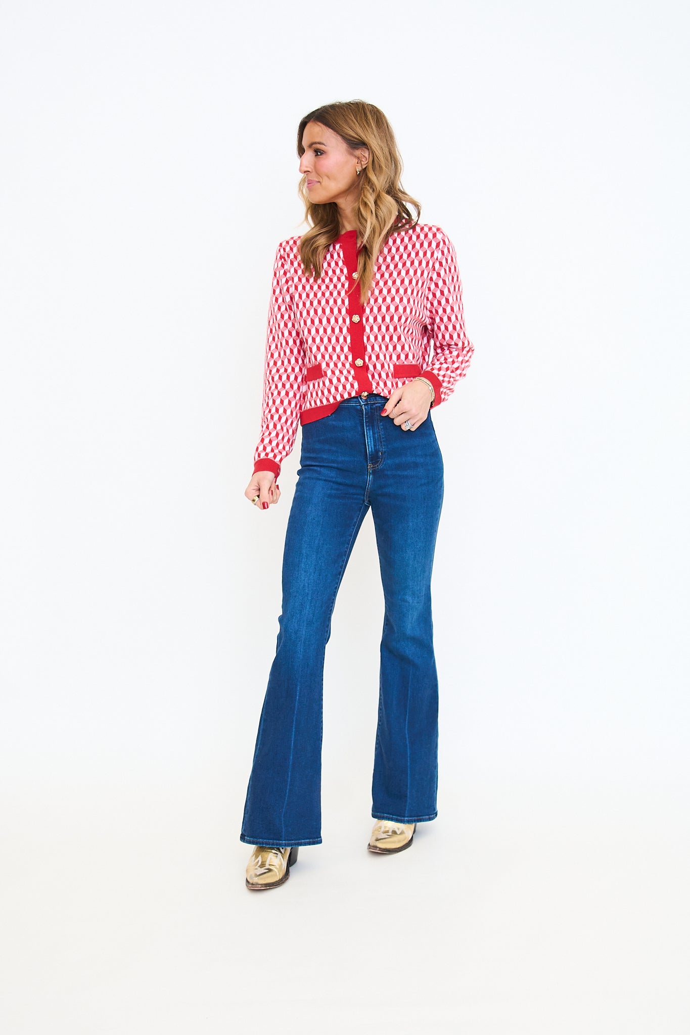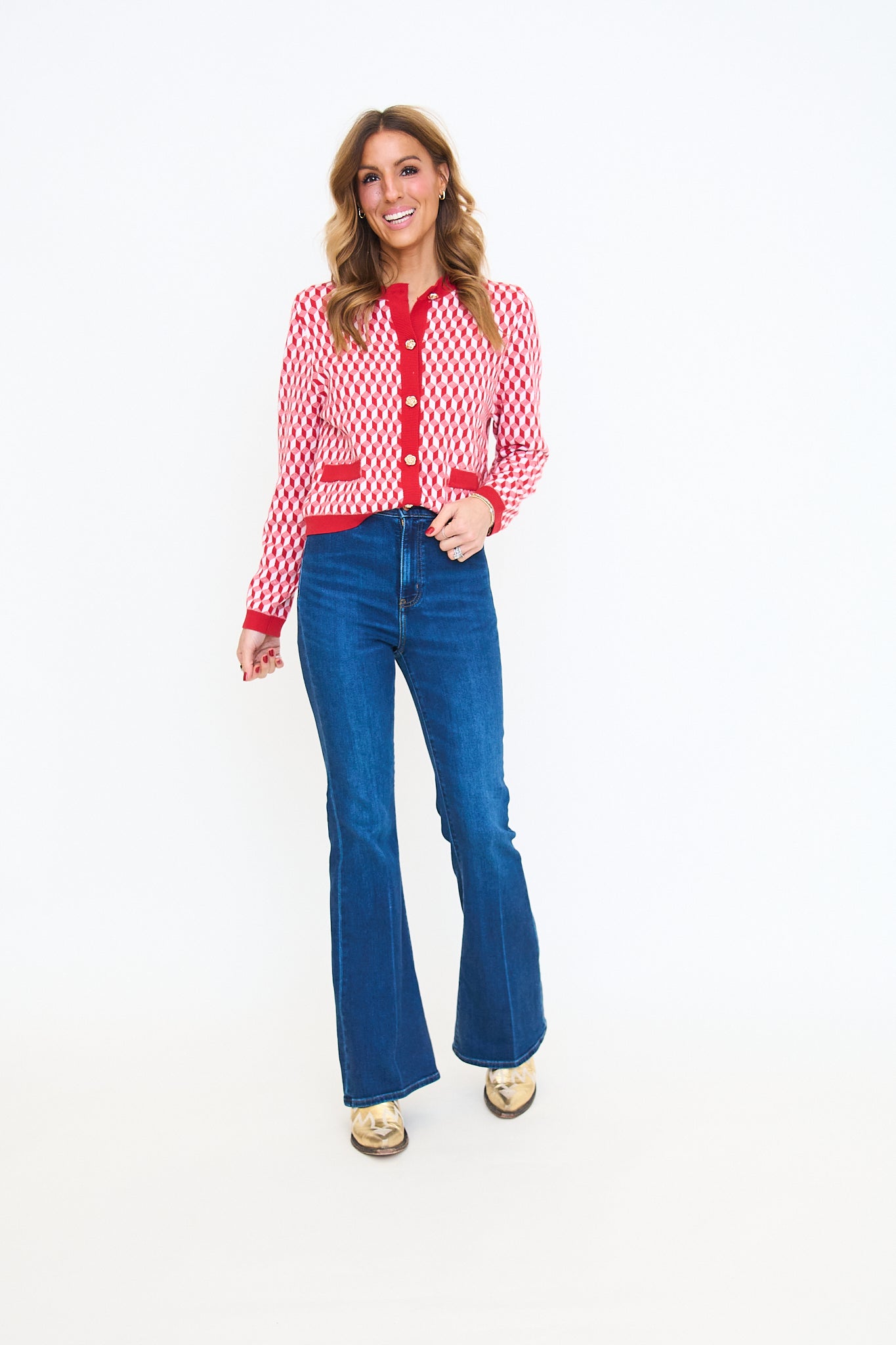 A spunky spin on a classic cardigan. This geometric patterned sweater features a bold red border and gold buttons down the front. Very soft fabircation.