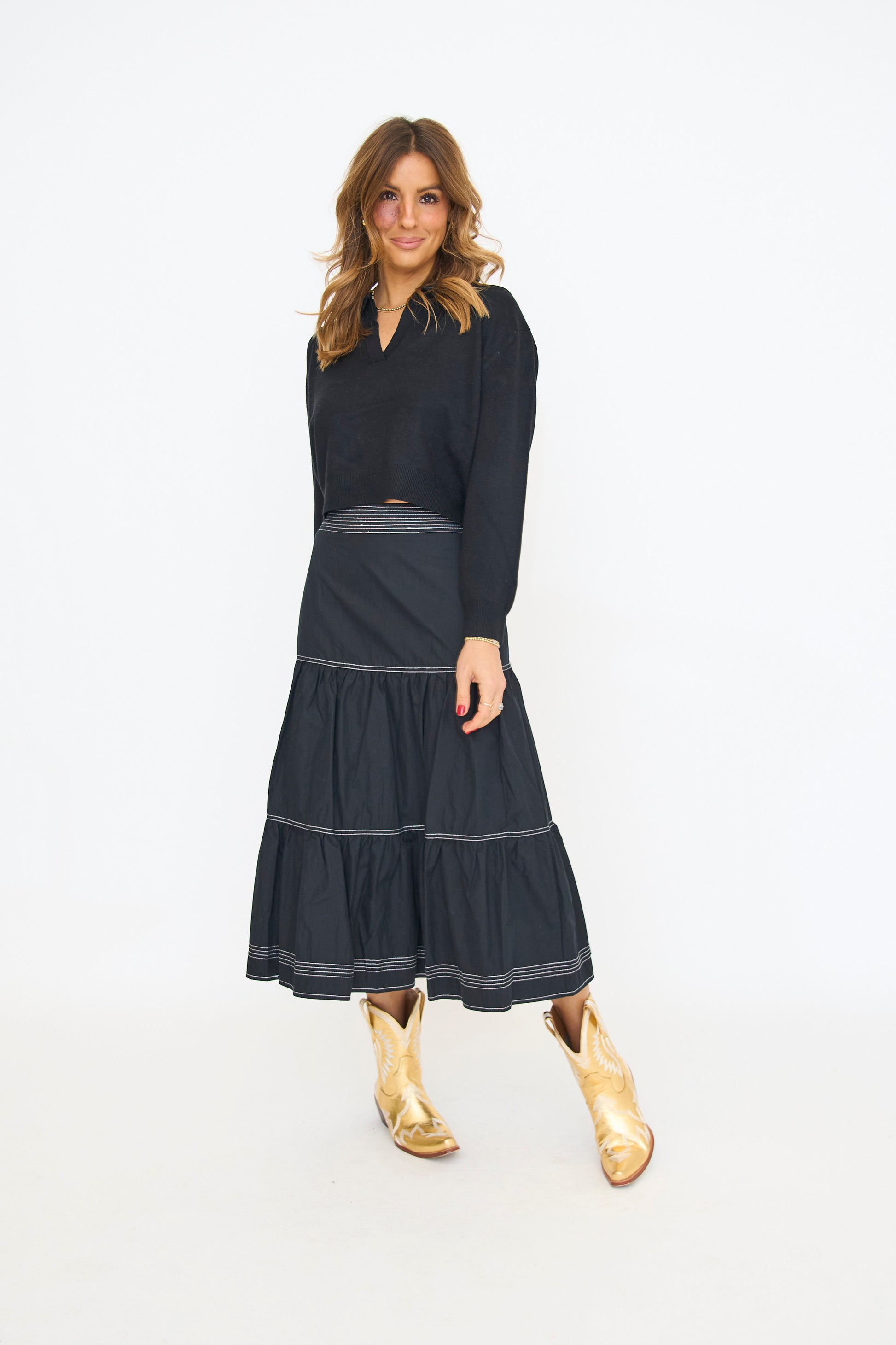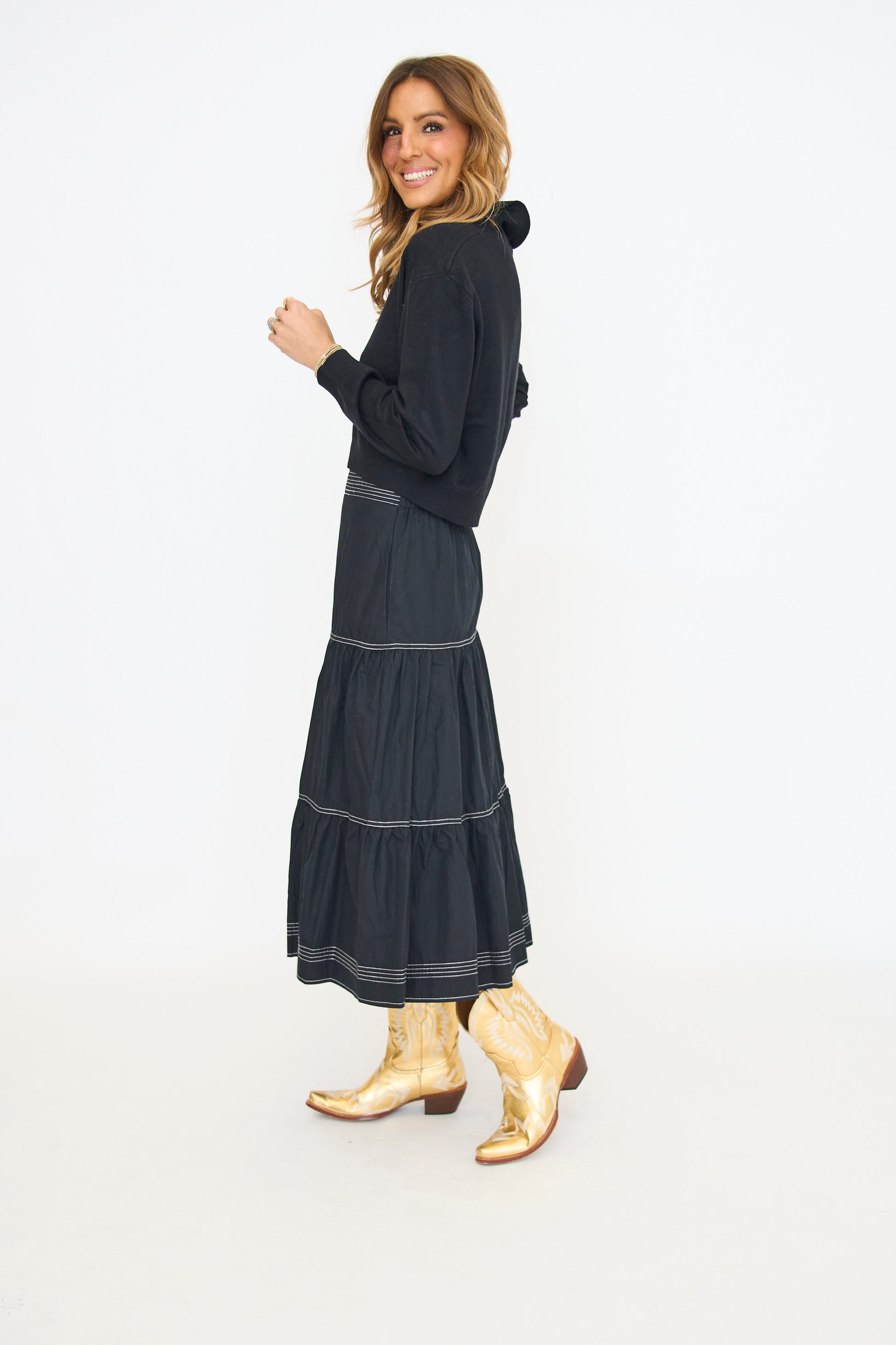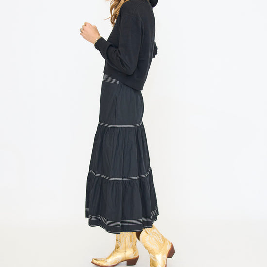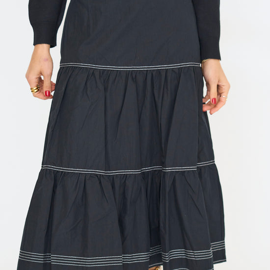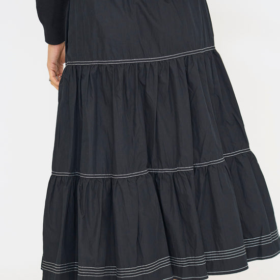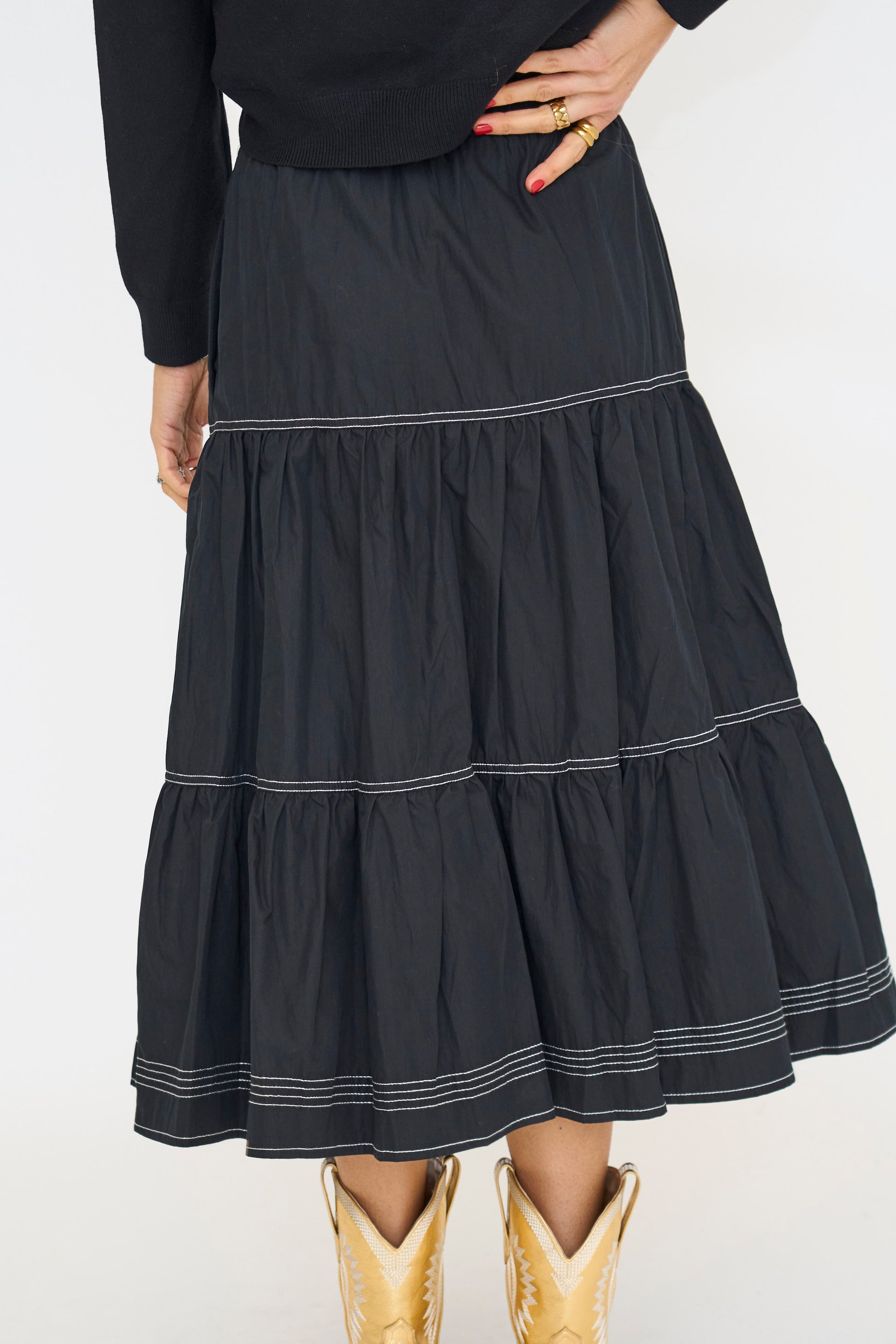 Top stitch tiered midi skirt in cotton poplin fabric.