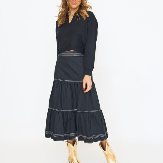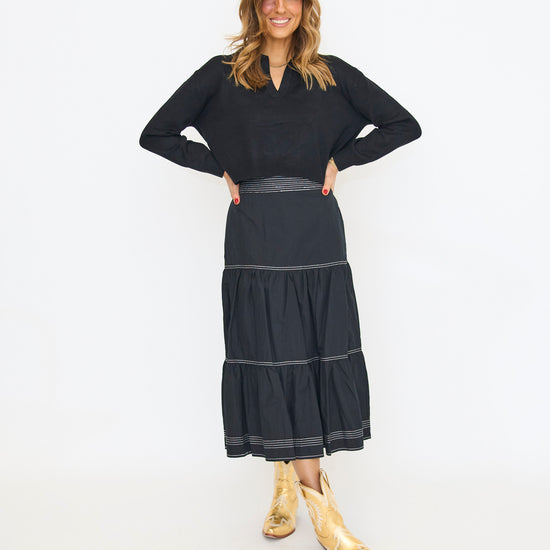 This versatile long skirt features tiered panel construction, elasticated waist at back, side pockets, and top stitched detail throughout.