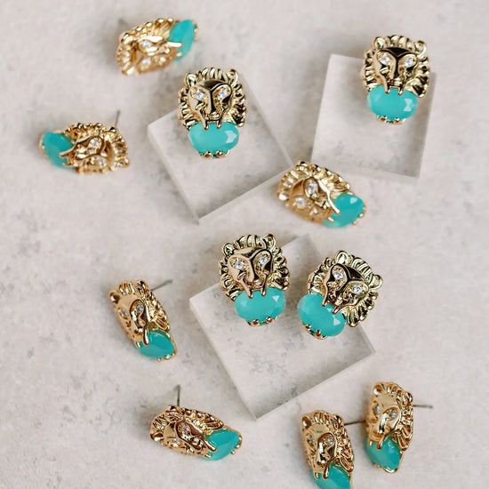 Our 80's-inspired Lionhead Stud Earrings feature an eye-catching turquoise stone and a luxurious shiny gold finish. The 1” compact size earrings are perfect for everyday or whenever you need a little shine.
