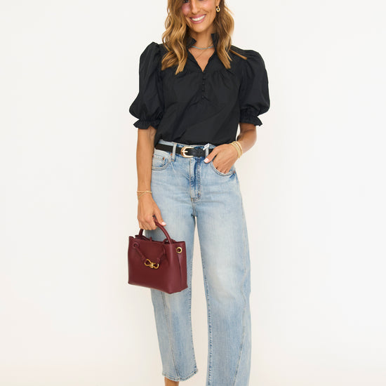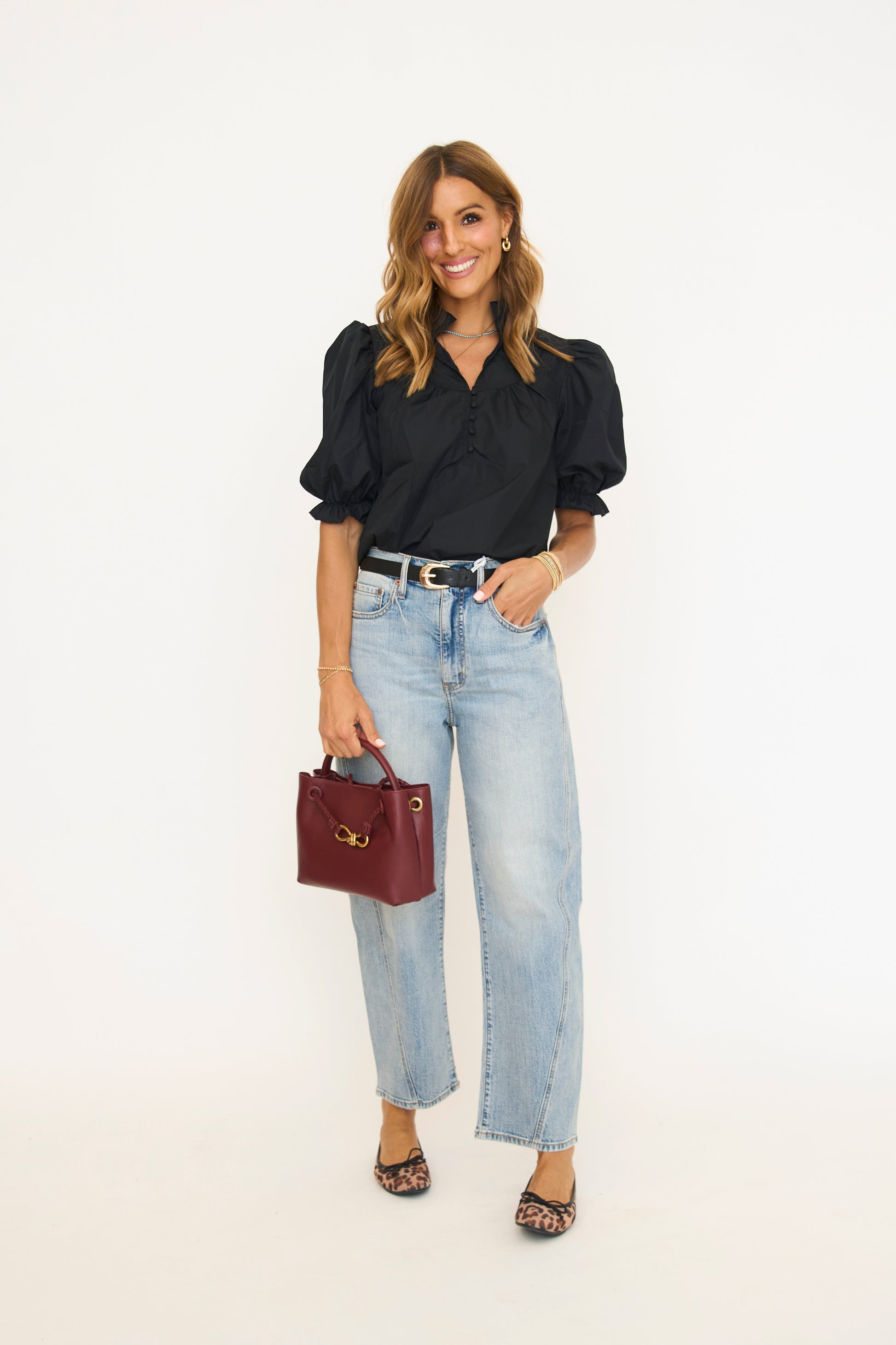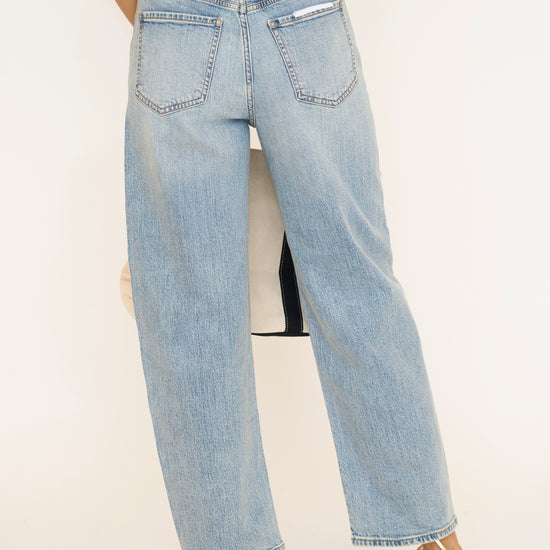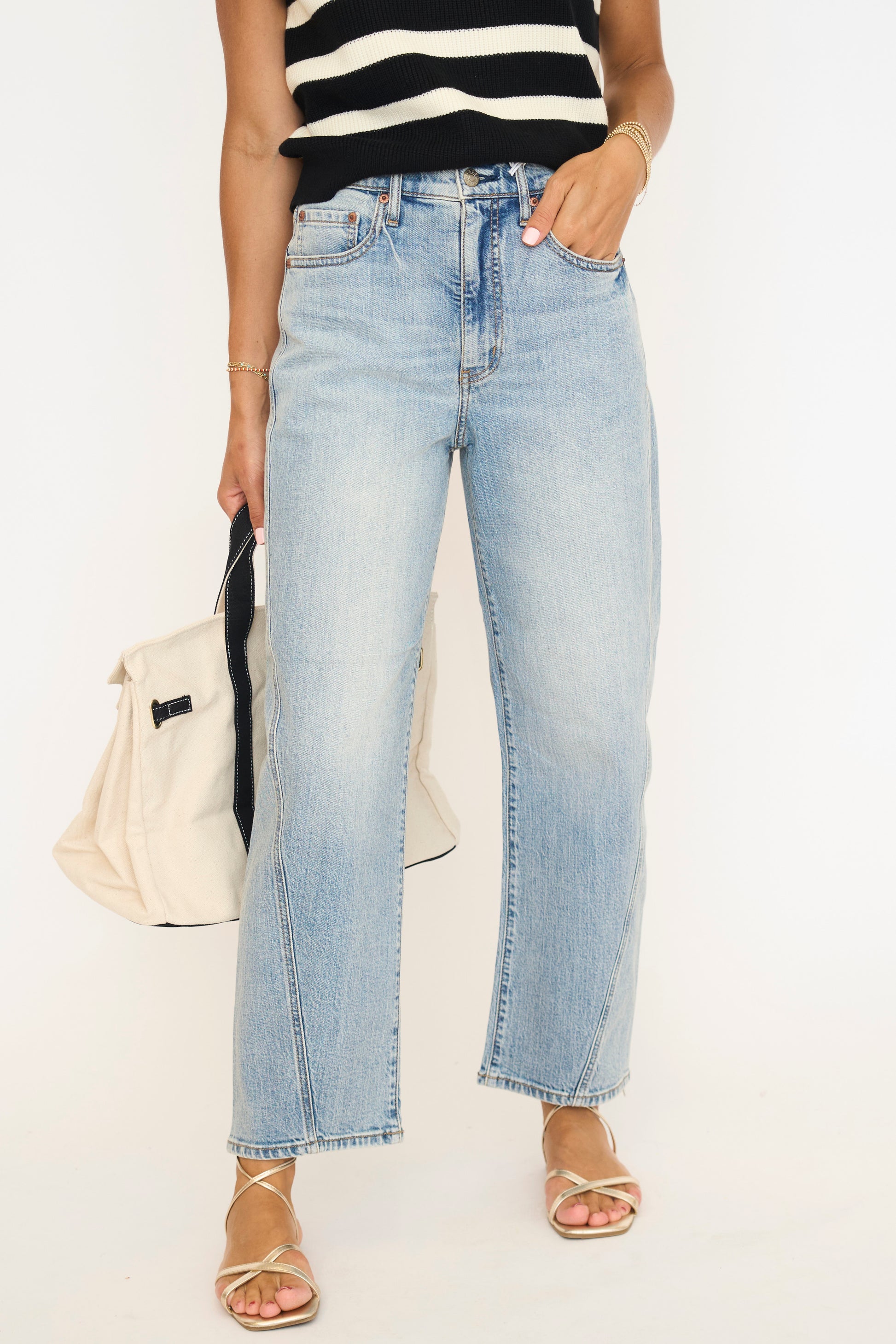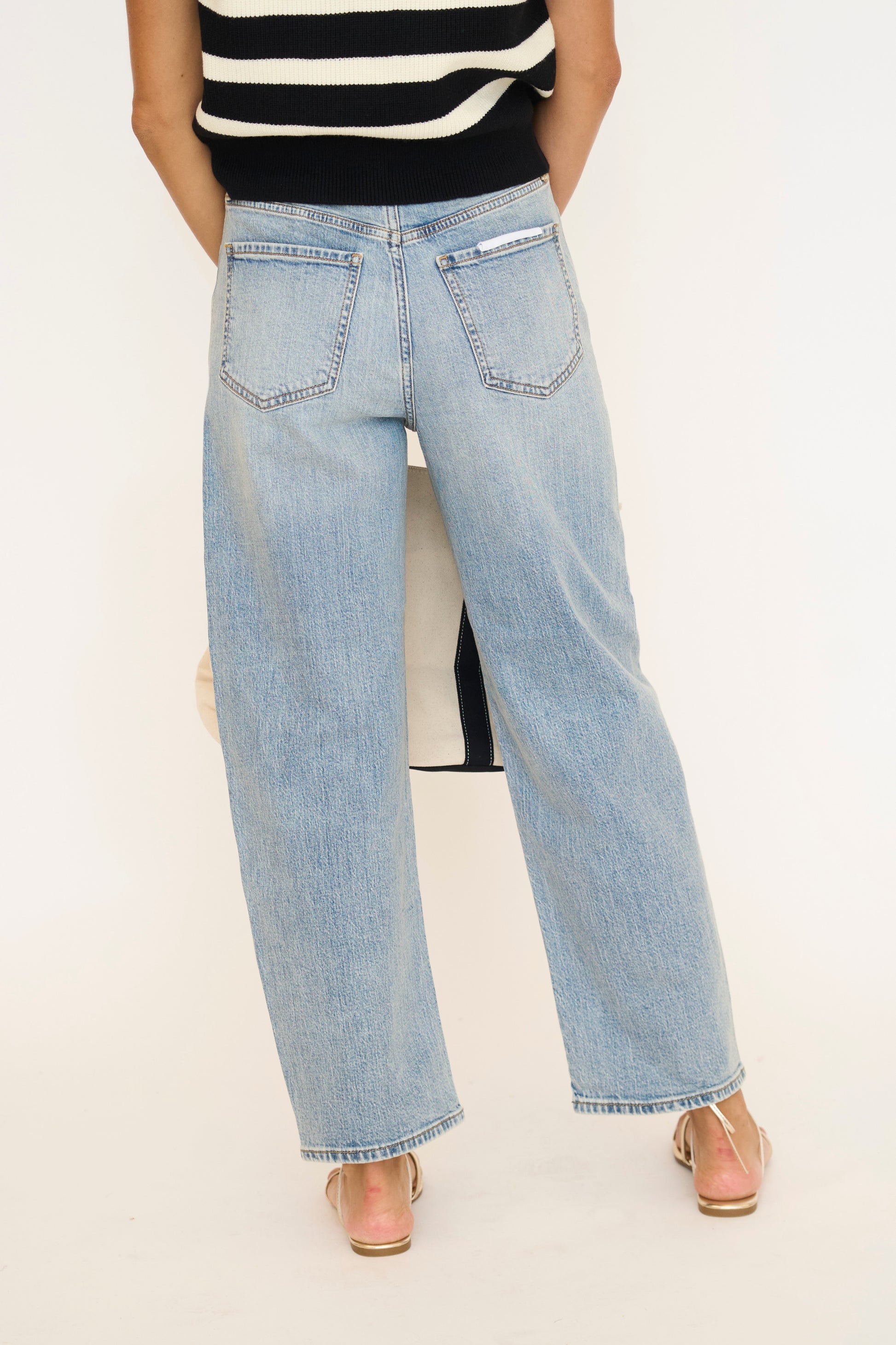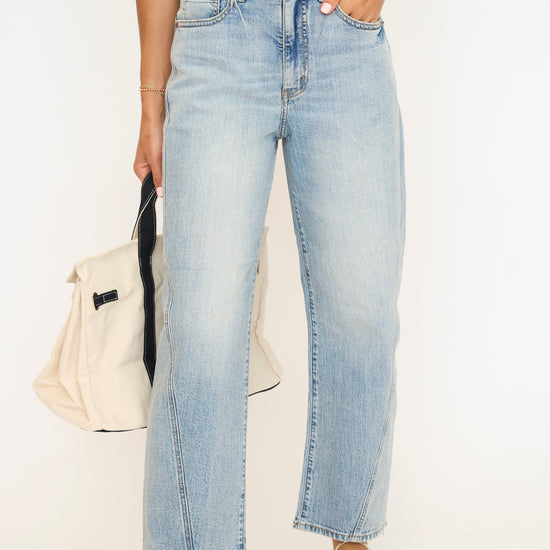 The Westward in Blur is a high rise jean with a barrel leg silhouette. Featuring a cinched waist, bowed leg, and slightly tapered ankle against a timeless light wash, this jean is as versatile as it is flattering.